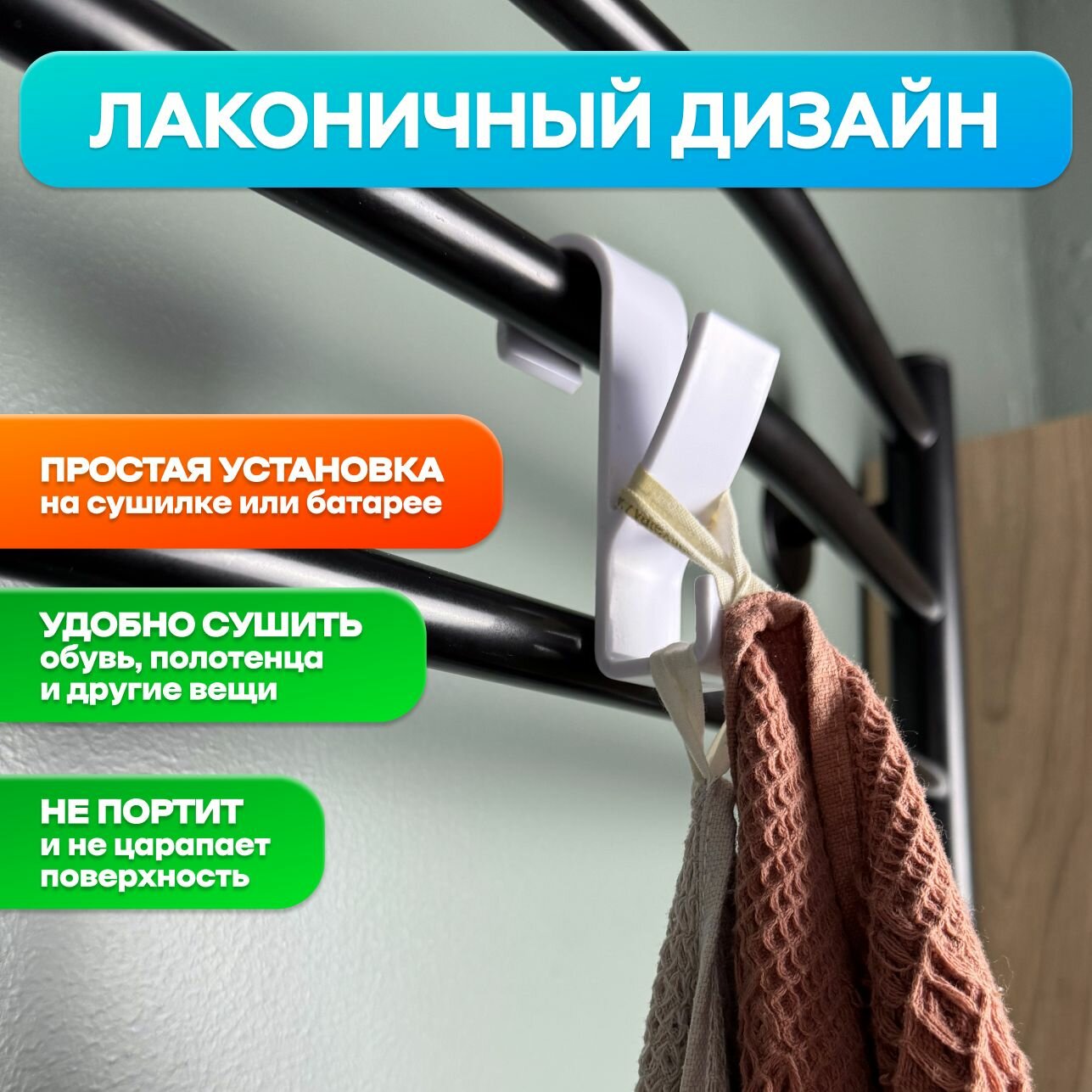 Черные крючки для полотенцесушителя в ванную комнату, 2 шт.