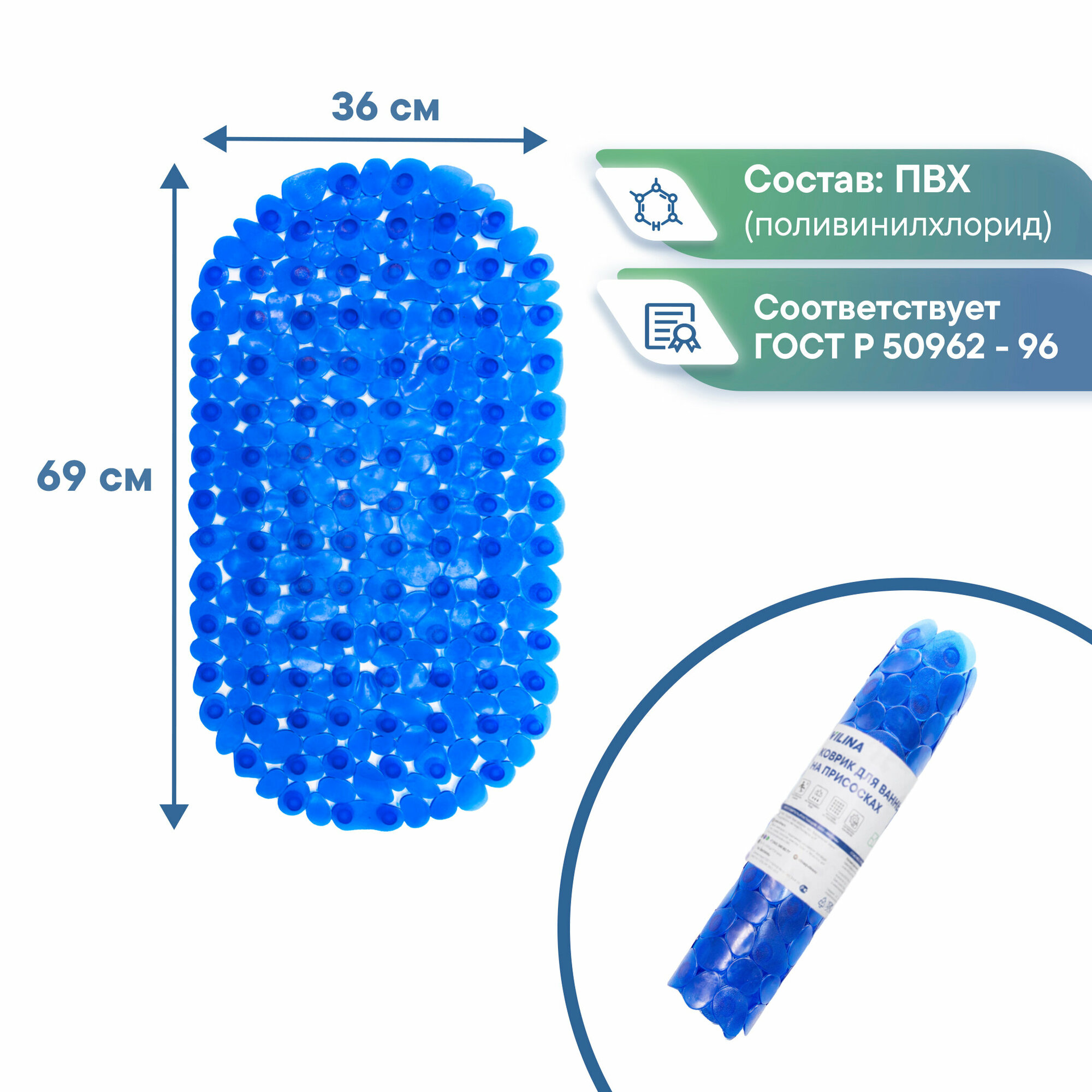 Купить Коврик для ванной на присосках Морская галька 69*36см, ПВХ, синий, овальный 6805 Вилина