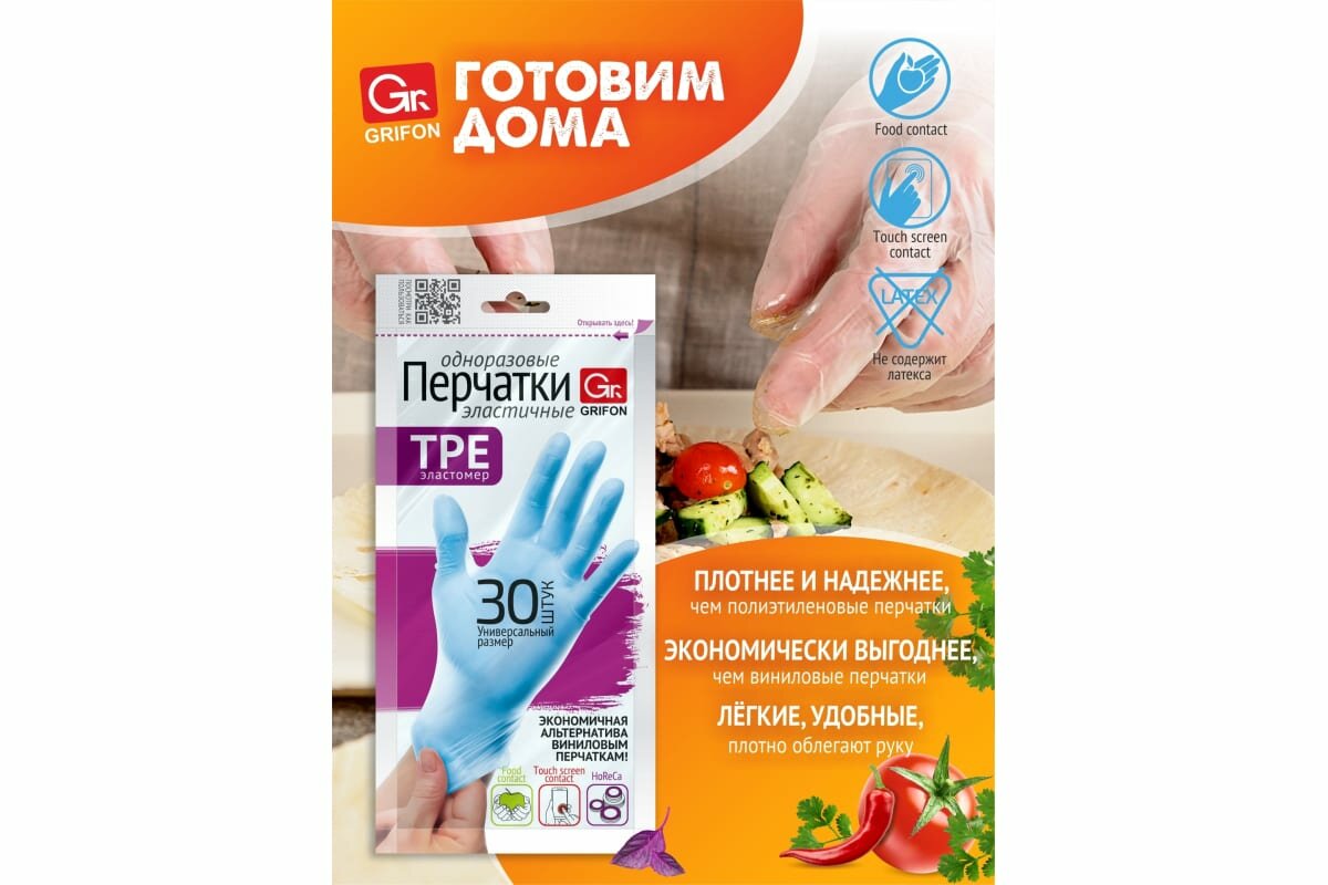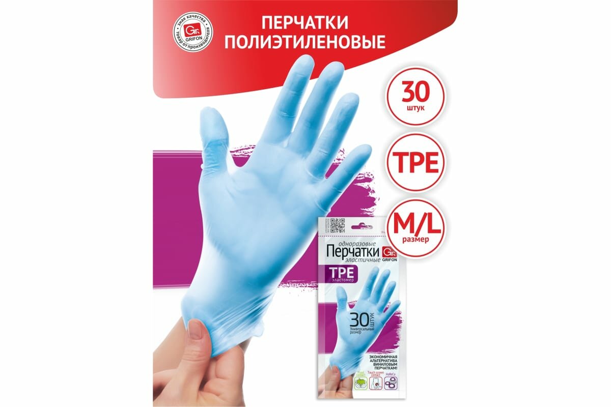 Перчатки хозяйственные TPE, одноразовые, универсальный размер, 30 шт, прозрачные, Grifon, 303-044 интересное: