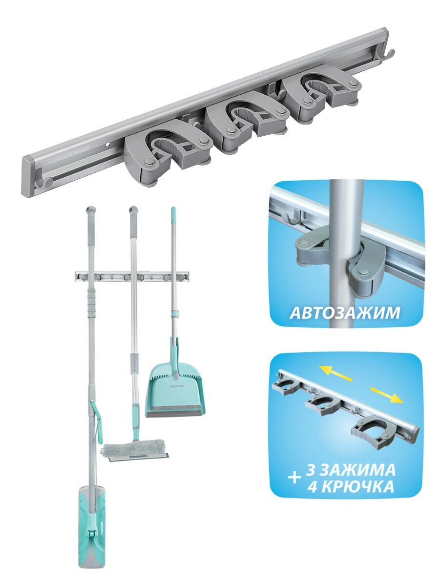 Держатель д/хоз. инвентаря, 41х6х4,2 см, алюминий/серый Hausmann (HM-GM-0840 Mop Holder 3+4 )