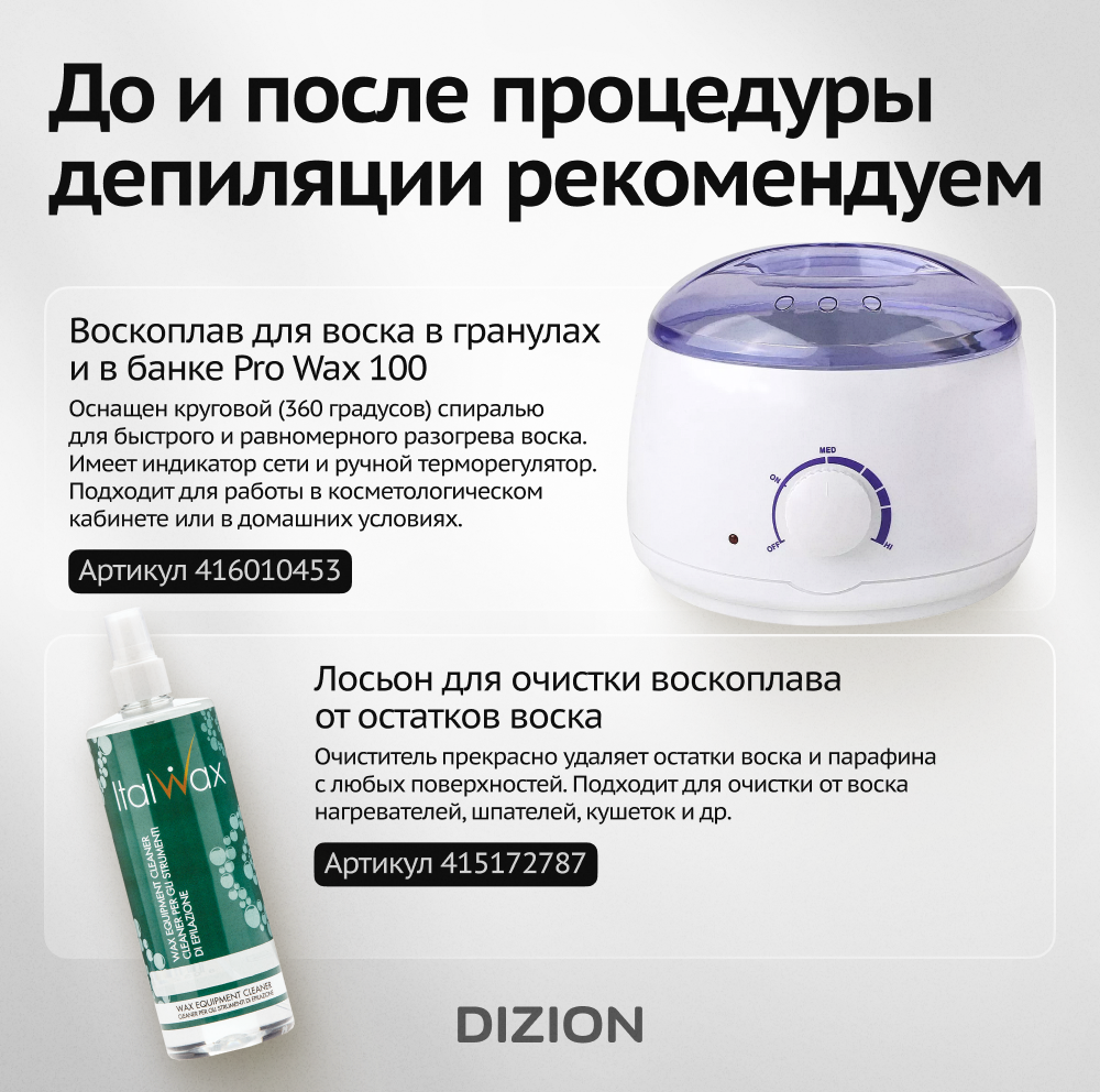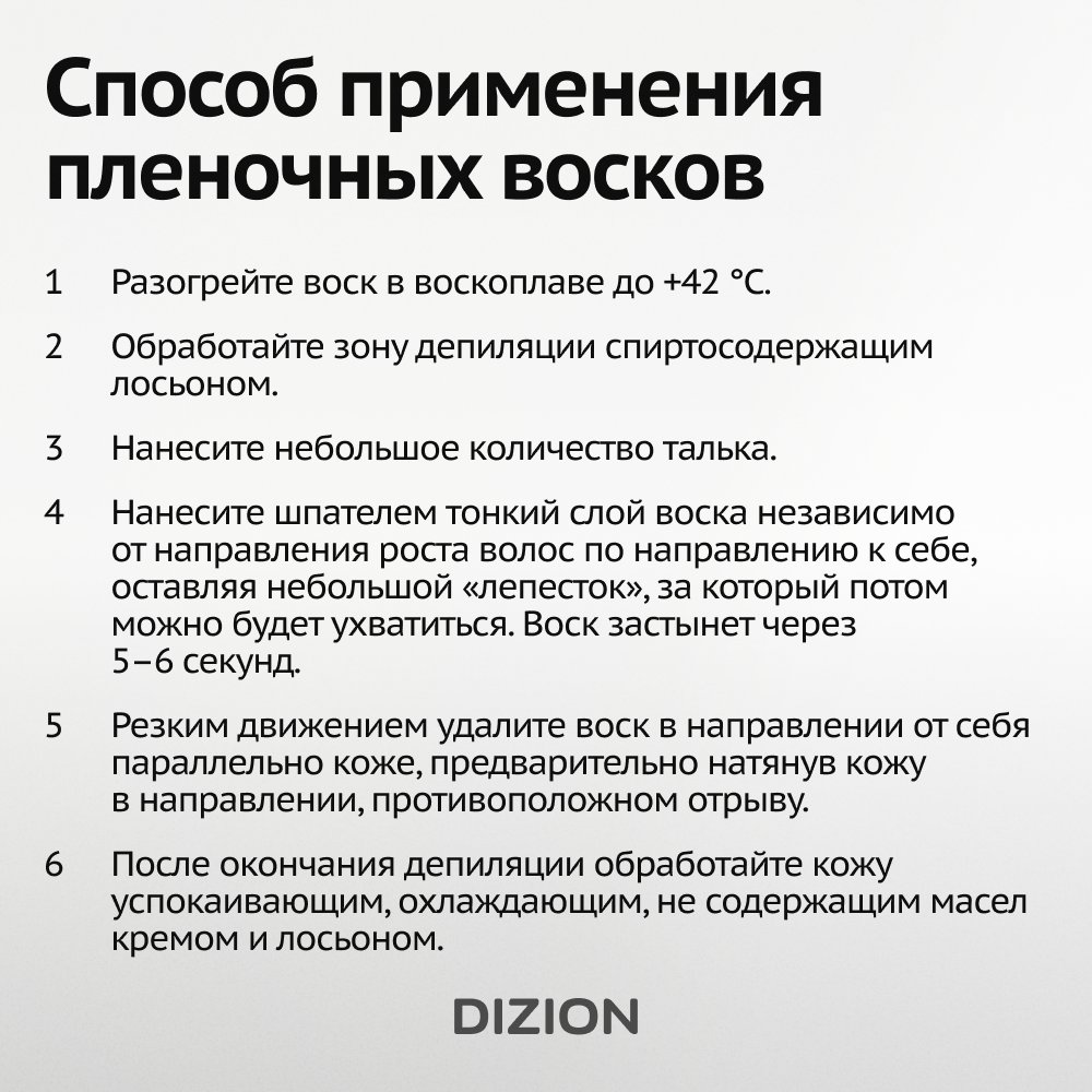 | Способ применения | разогрейте воск в электронагревателе до t + 42°С; зону депиляции обработайте спиртосодержащим лосьоном; нанесите небольшое количество талька; нанесите шпателем тонкий слой воска независимо от направления роста волос, но по направлению к себе, оставляя небольшой «лепесток», за который потом можно будет ухватиться (подмышку стараемся депилировать одной аппликацией); наносите не торопясь, тщательно нажимайте на шпатель, прикладывая необходимые усилия; воск застынет через 5-6 секунд (готовый к удалению воск не должен липнуть к руке при касании); предварительно натянув кожу в направлении, противоположном отрыву, резким движением удалите воск в направлении от себя параллельно коже; повторите процедуру на следующем участке; после окончания депиляции обработайте кожу успокаивающим, охлаждающим, не содержащим масел, средством: крем/гель охлаждающий, лосьон-эмульсия |