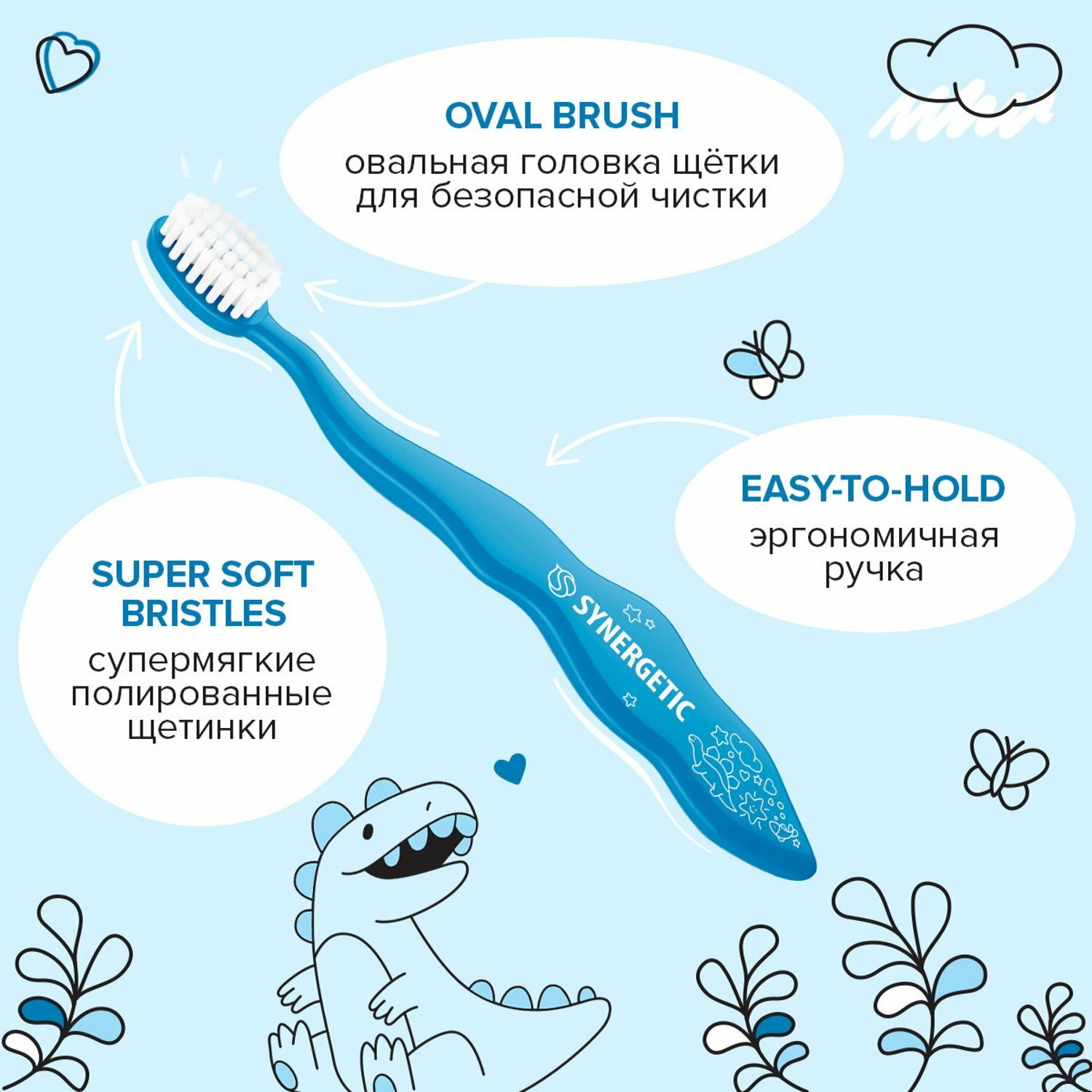 Детская зубная щетка Synergetic для детей от 3 до 6 лет, мягкая (голубая)