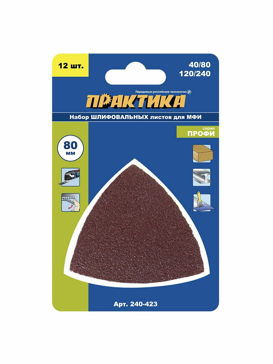 Насадка для МФИ ПРАКТИКА шлифовальные листы, 12 штук, дельта, 80 мм, крепление VELCRO, без отверстий, зернистость P40-180