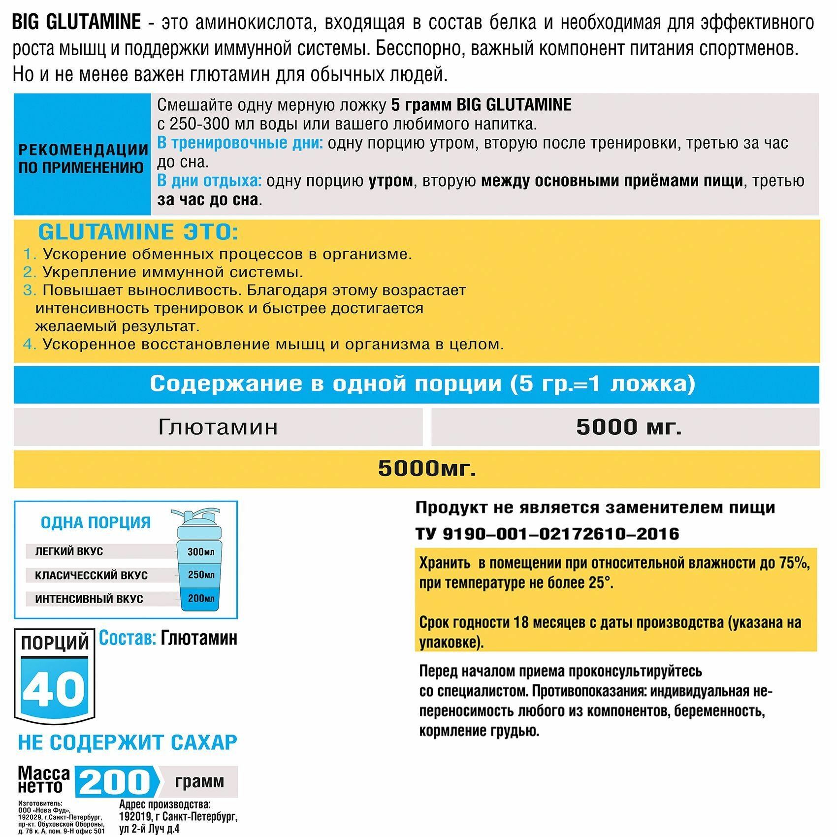 Купить Глютамин BIGSNT / аминокислота для роста мышц и укрепления иммунитета / порошок, 200 г (40 порций), без вкуса