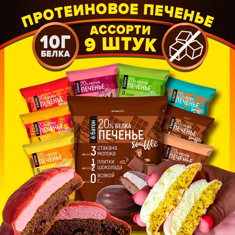 Протеиновое печенье ё|батон с белковым суфле Ассорти разных вкусов 9 шт по 50 г