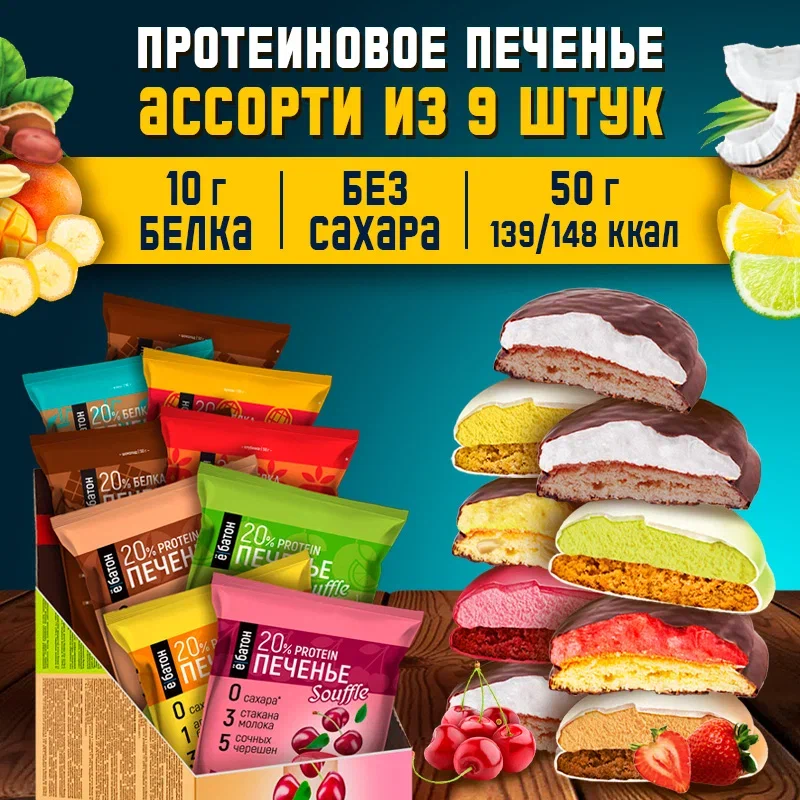 Купить Протеиновое печенье ё/батон с белковым суфле Ассорти (манго-банан, кофе,черешня, лимон-лайм, клубника, кокос, шоколад, арахис) 9 шт по 50 г