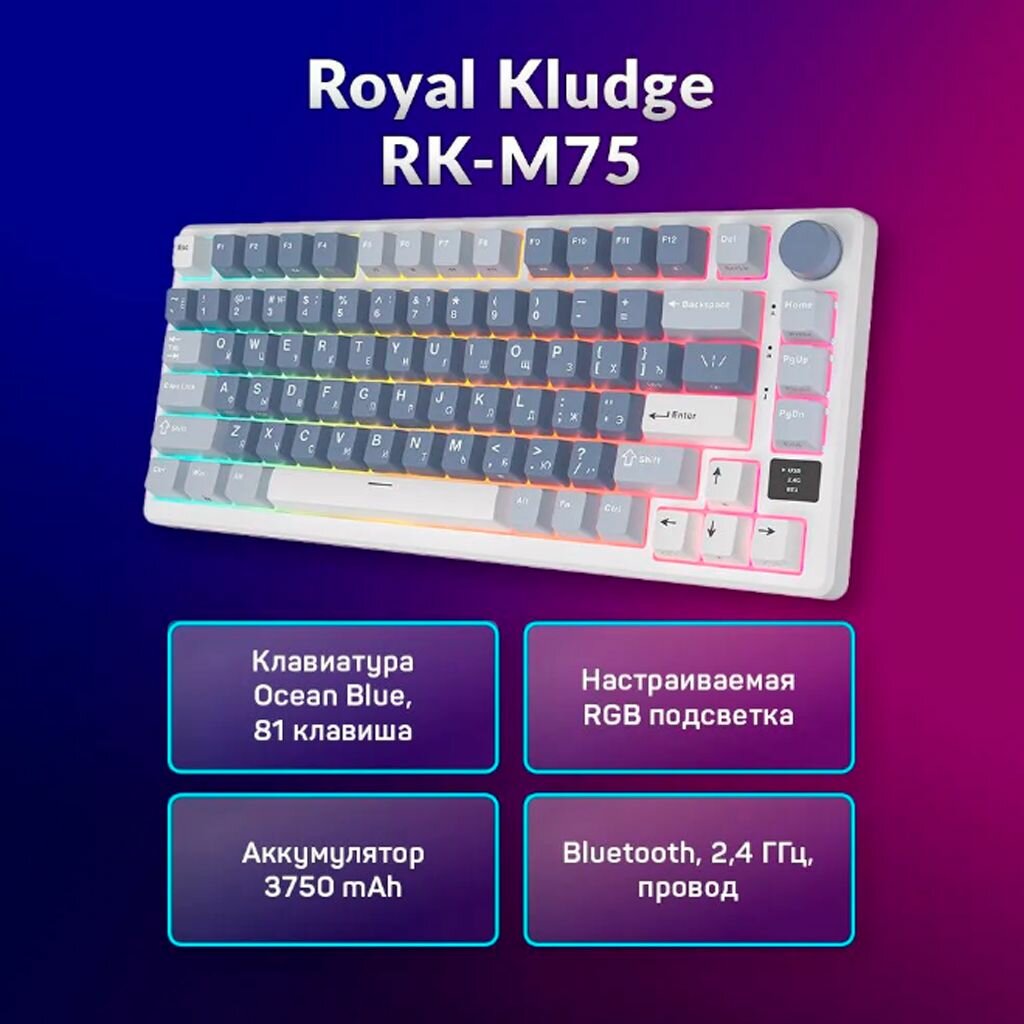 Компактная (75%) механическая клавиатура Royal Kludge RK-M75 - 3 типа подключения, 81 клавиша, Gasket Mount, Ocean Blue, переключатели RK Silver