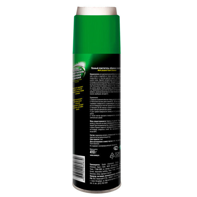 | Способ применения | хорошо встряхните баллон перед использованием. распылите состав с расстояния 20 – 30 см на обрабатываемую поверхность и равномерно распределите его по поверхности чистой тряпкой или губкой; выждите 20 – 30 секунд и обработайте поверхность сухой, мягкой тряпкой или губкой; для грубой поверхности (ковер и т.п.) используйте щетку; после чистки протрите поверхность сухой мягкой тряпкой или губкой |