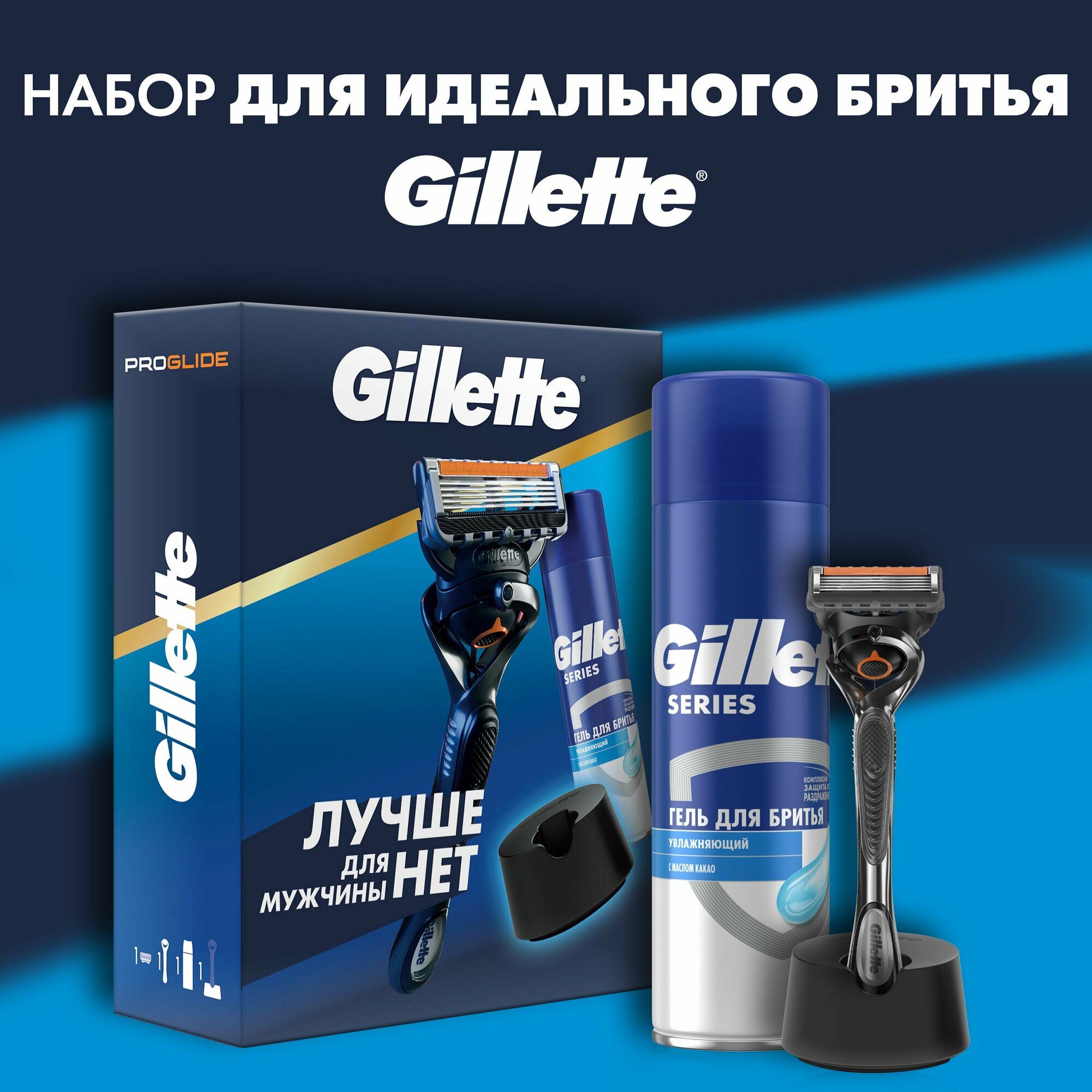 Подарочный набор мужской для идеального бритья Gillette ProGlide с увлажняющим гелем для бритья и подставкой для бритвы