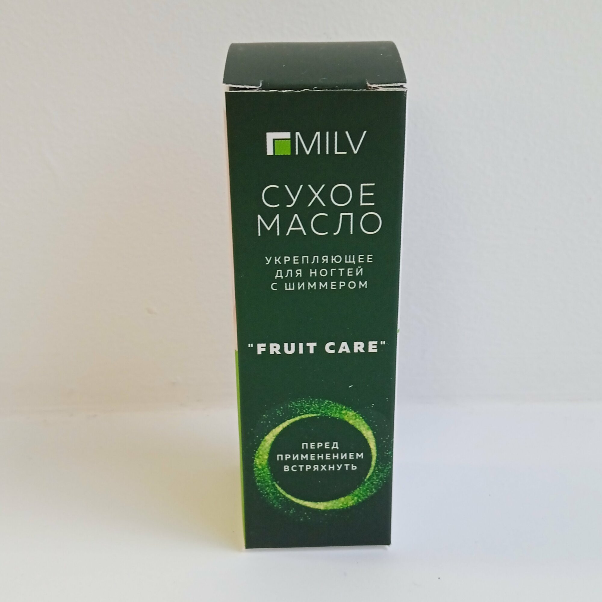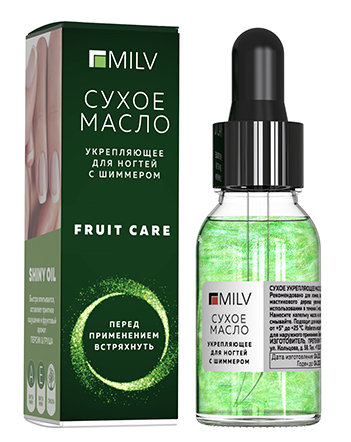 | Комплектация | Сухое укрепляющее масло для ногтей Milv Fruit care, с шиммером, 15 мл |