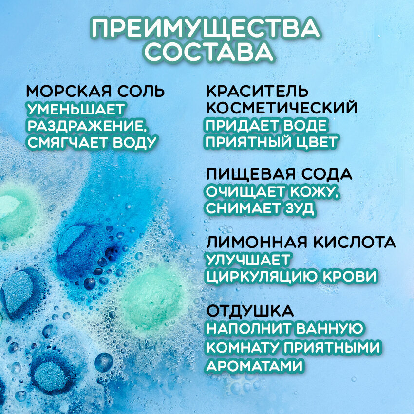 | Состав | Ароматизатор, сода пищевая, морская соль, краситель косметический, кислота лимонная, сухая пена для ванн. |