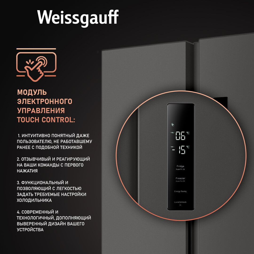 СохранитьОтдельностоящий холодильник с инвертором Weissgauff WSBS 500 Inverter NoFrost Dark Grey Side by Side двухдверный, 3 года гарантии, Мощность замораживания 12 кг сутки, Сенсорное управление, Цифровой дисплей, LED освещение интересное:
