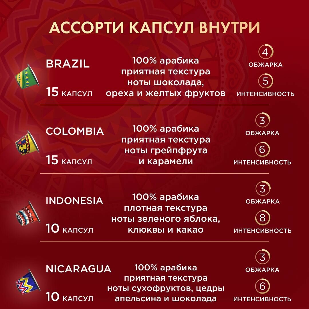 | Состав набора | Classico Italiano 5 шт. Crema Delicato 5 шт. Ristretto 5 шт. Lungo 5 шт. Vanilla 5 шт. Caramel 5 шт. |