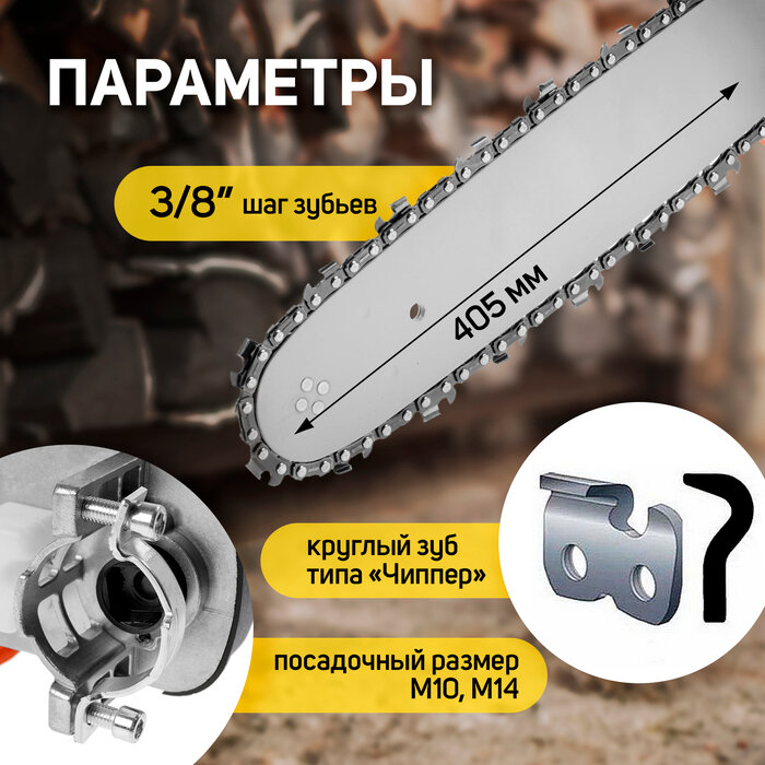 Насадка для УШМ тундра, цепная пила, 405 мм 16", 59 звеньев, 1.3 мм, шаг 3/8", M10, М14 (комплект из 2 шт) интересное: