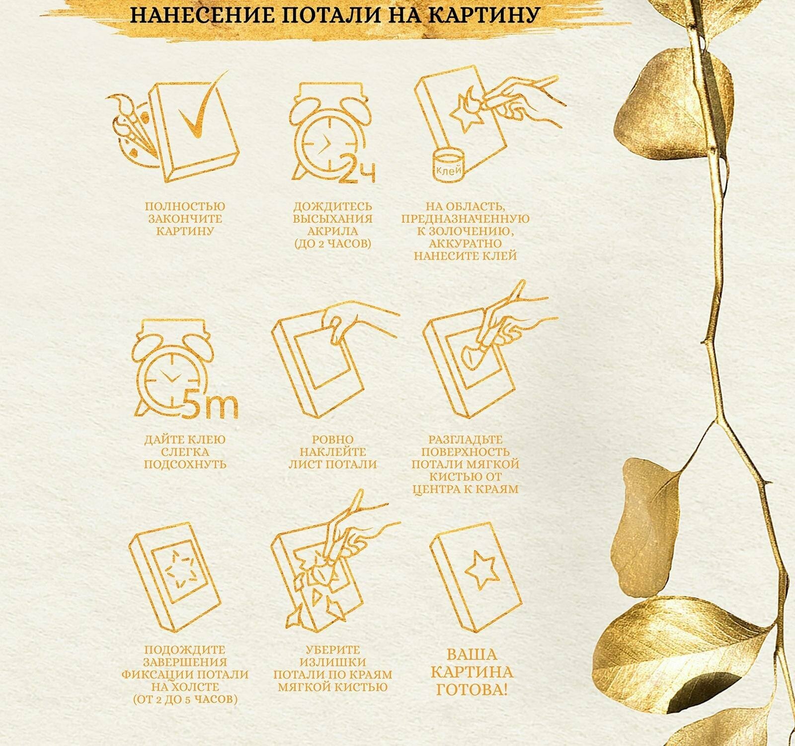 | Комплектация | холст из натурального хлопка на деревянном подрамнике (холст предварительно прогрунтован), 2 нейлоновые кисти разного размера, профессиональные акриловые краски (устойчивые к выцветанию), поталь (5 листов), финишный лак, фиксатор для потали. |