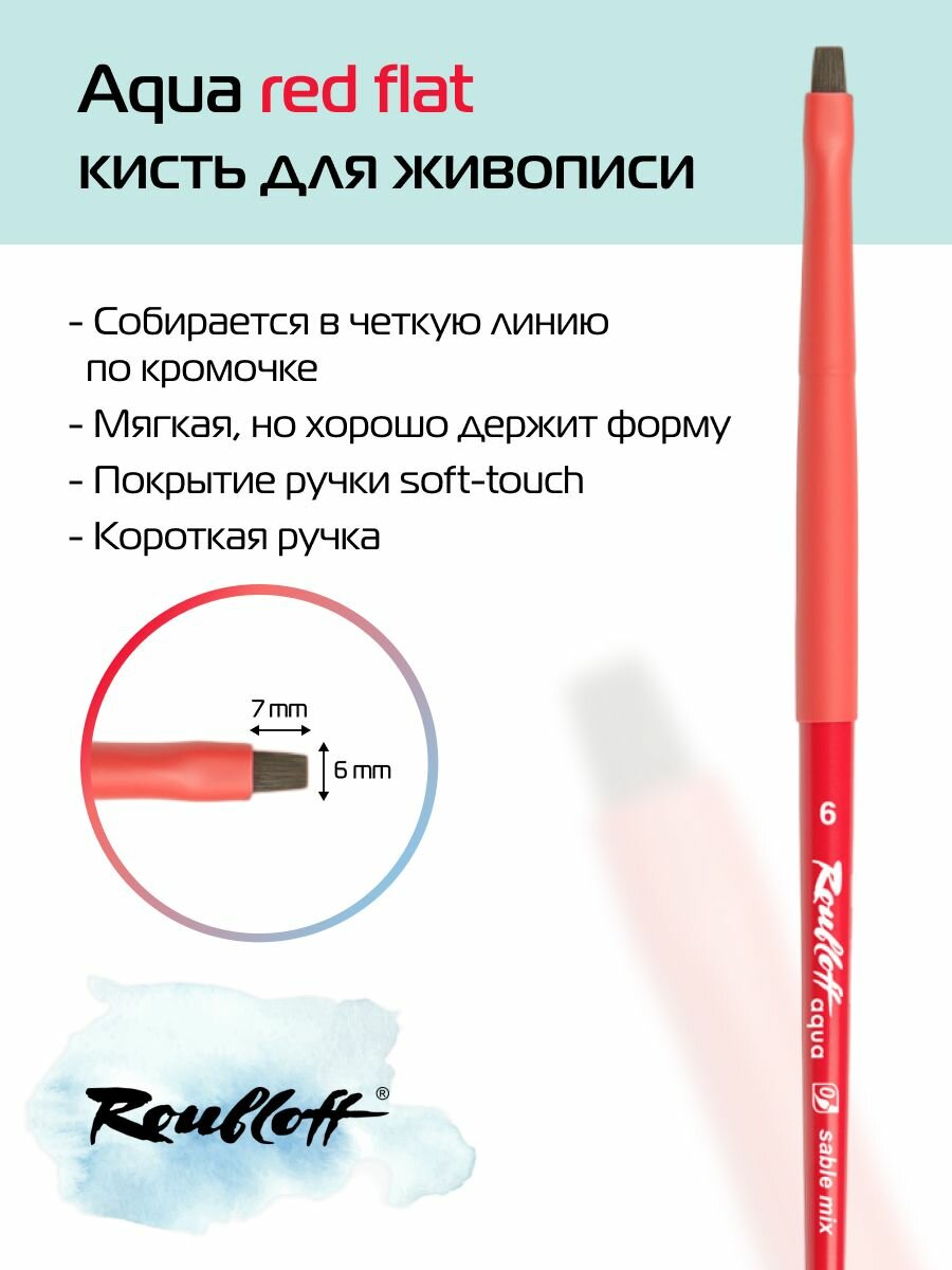Roubloff Aqua Red flat кисть художественная соболь микс для акварели № 6 плоская, покрытие soft-touch