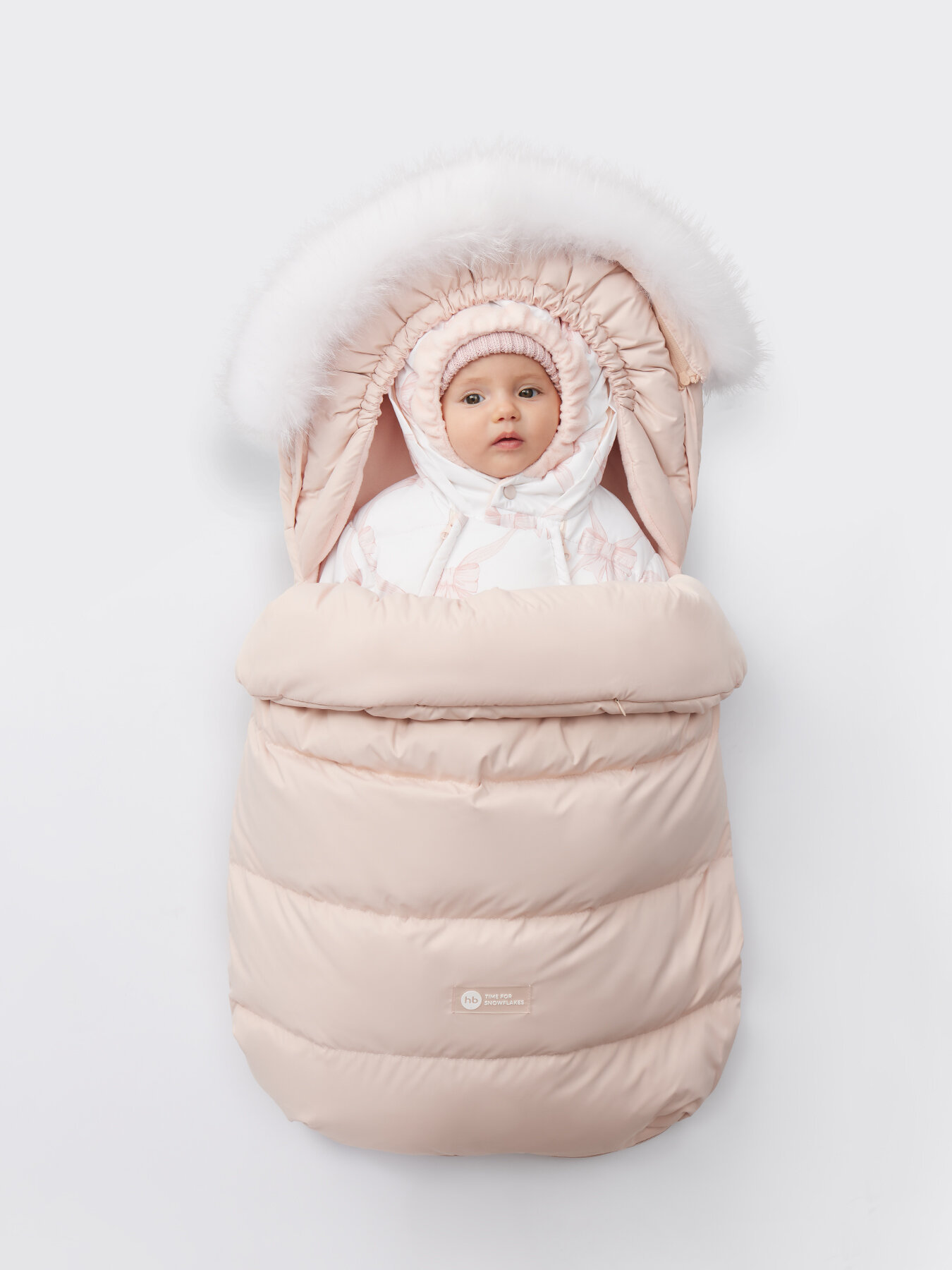 89083, Комбинезон для новорожденных зимний, комбинезон для мальчиков и девочек, опушка из меха енота, конверт в коляску, бежевый, рост 68-74