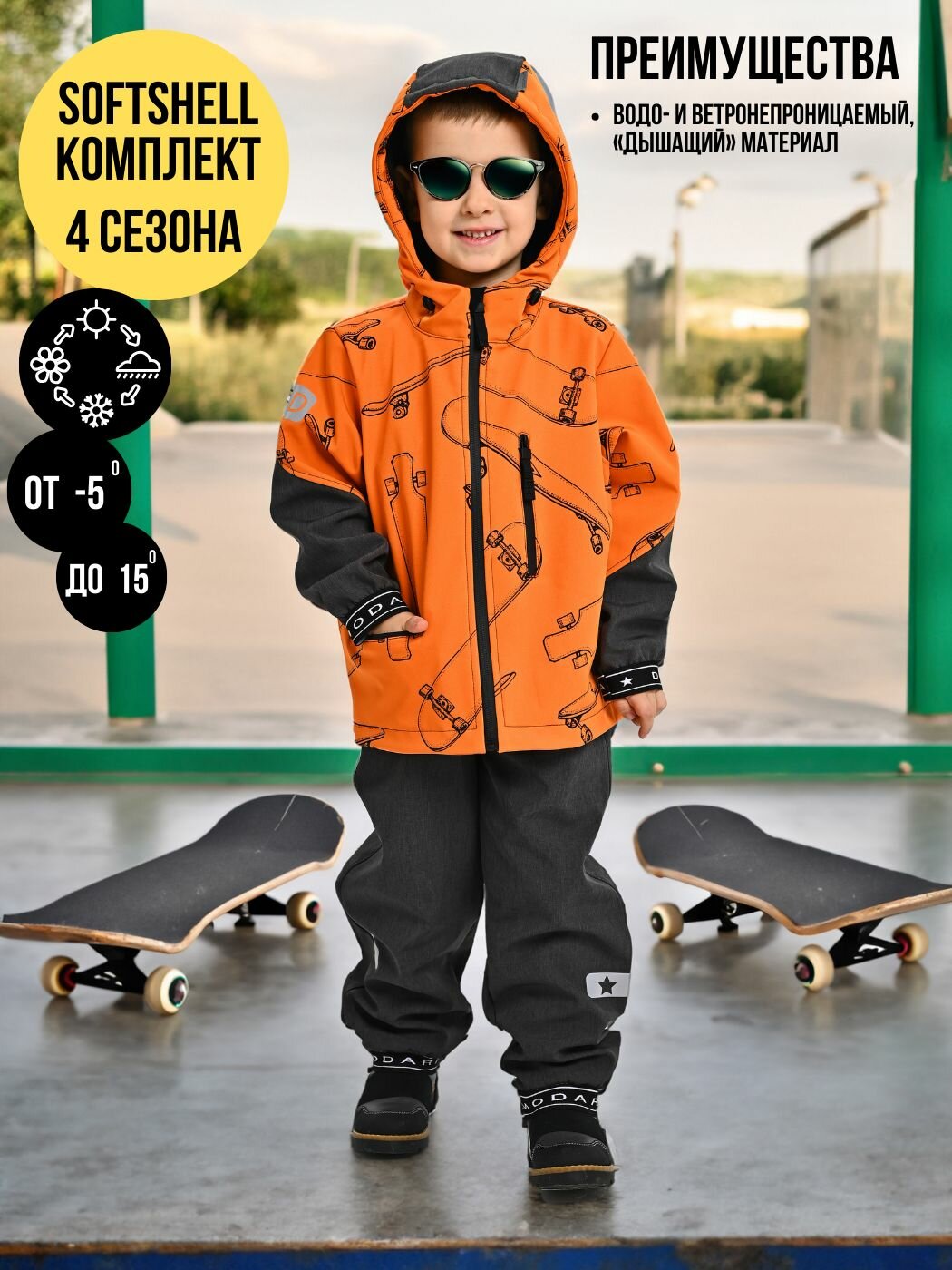 Купить Комплект ( Куртка+ Полукомбинезон), Весна-Осень, SoftShell, оранжевые скейты арт. 420С (104 см)