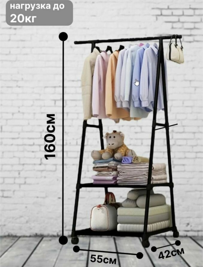 Напольная гардеробная вешалка стойка в прихожую для хранения одежды, обуви и вещей / Черная высокая этажерка стеллаж на колесиках с 2 полками