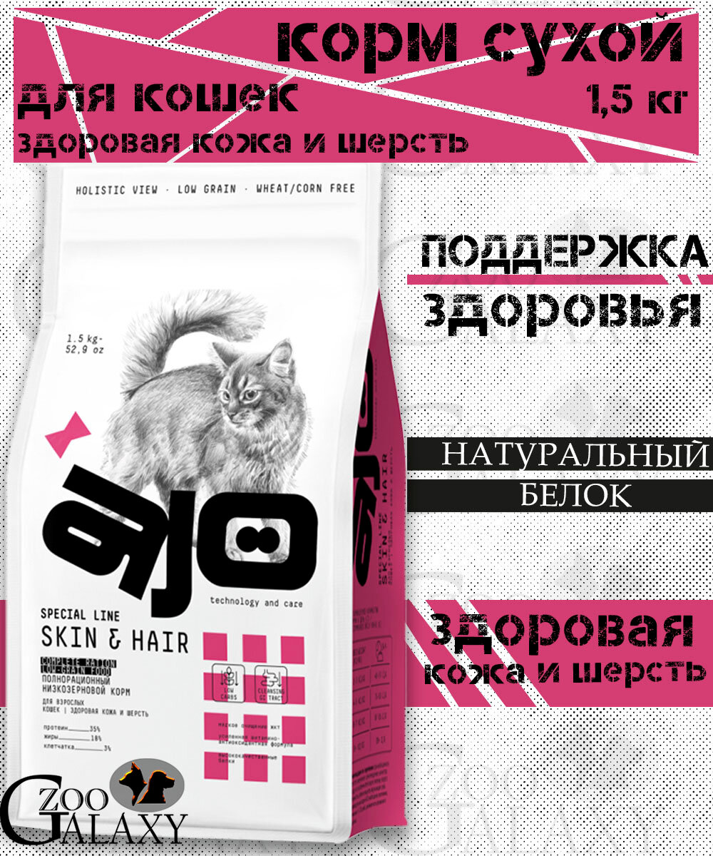 Сухой корм AJO Cat Skin & Hair для кошек, здоровая кожа и красивая шерсть 1.5 кг