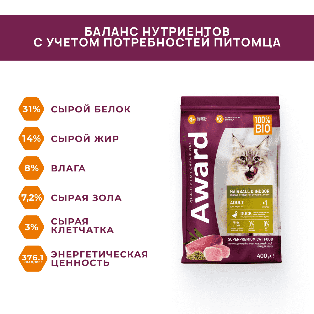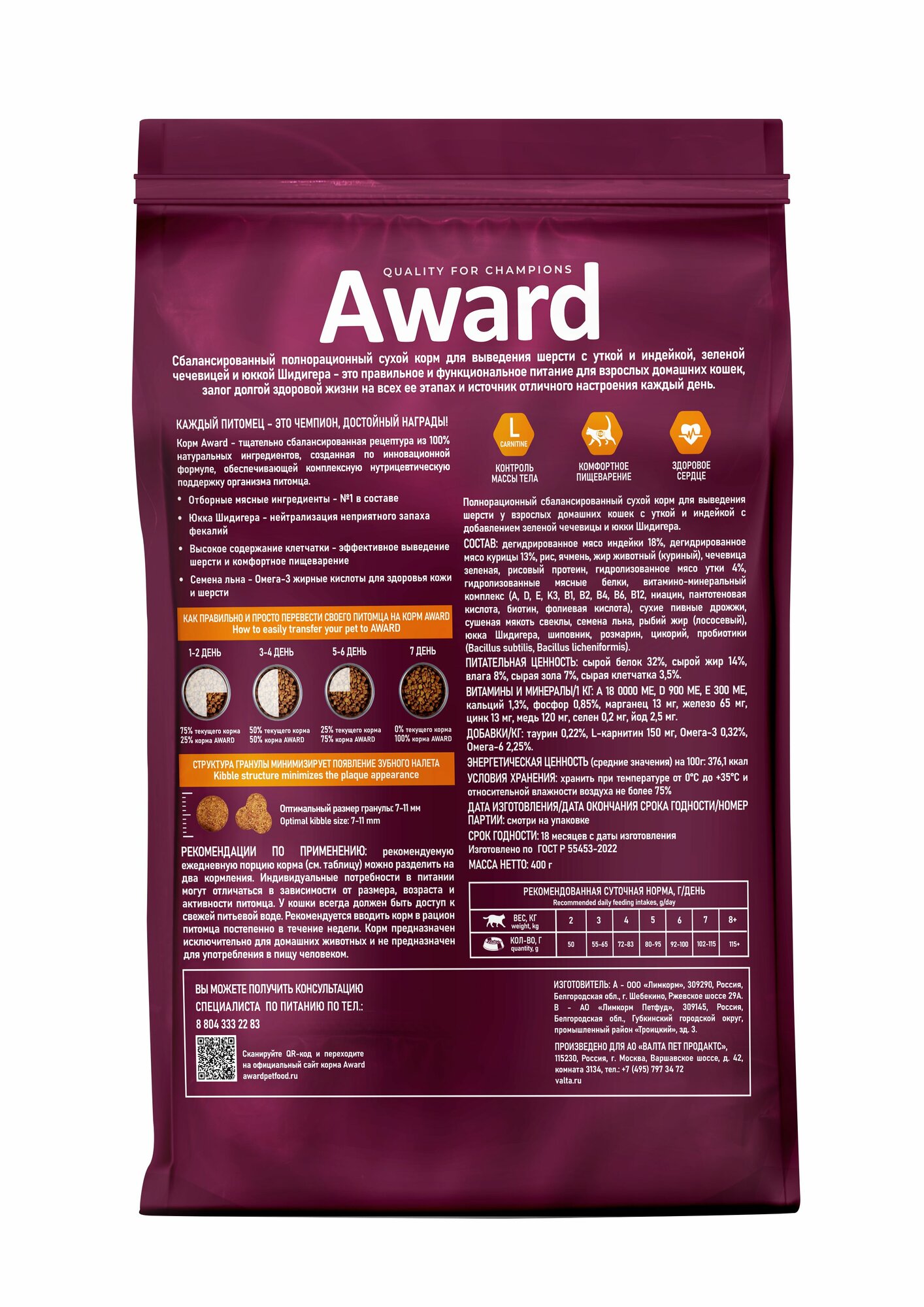 AWARD сухой корм для взрослых кошек для выведения шерсти (утка, индейка, чечевица, юкка) 400г