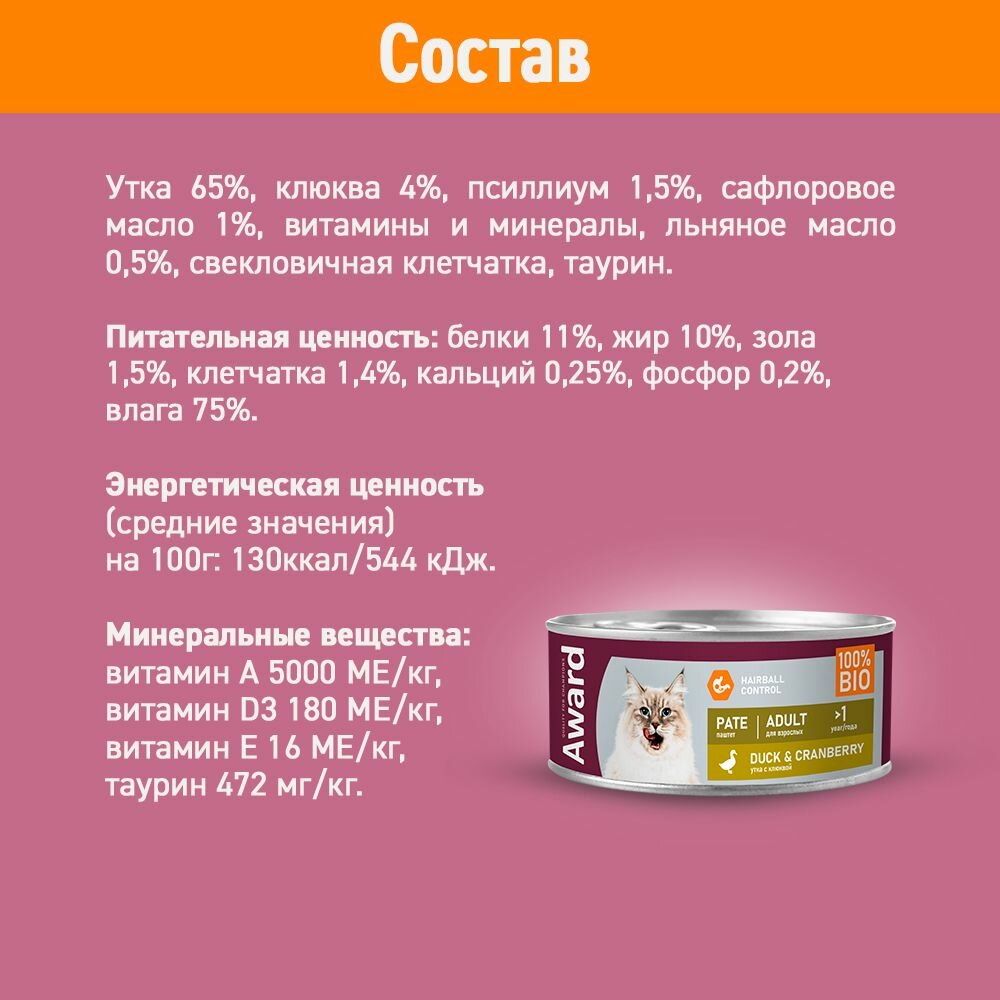 Влажный корм AWARD для кошек паштет из утки с клюквой 100г * 16 шт