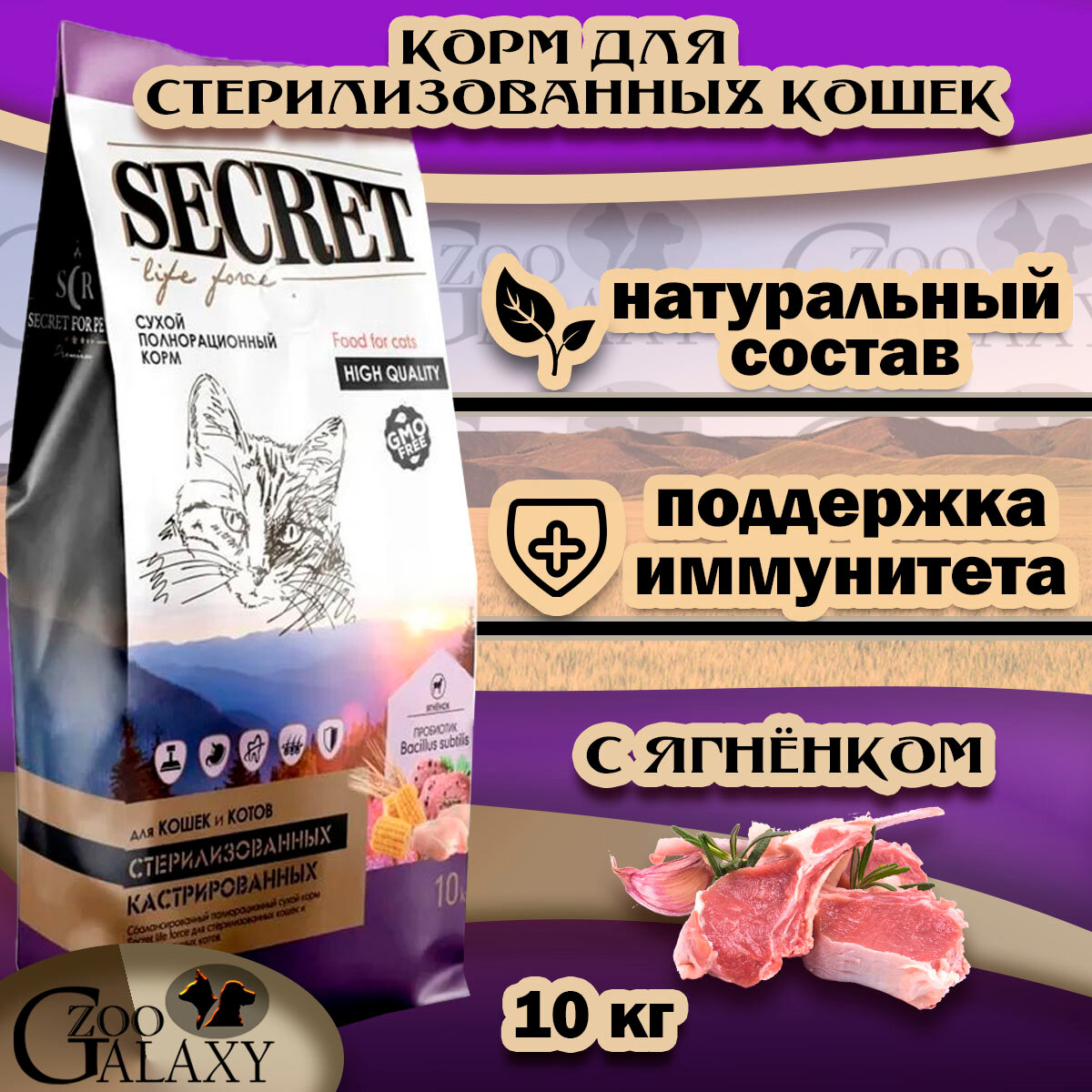 Корм Секрет Премиум для стерилизованных кошек и кастрированных котов с ягнёнком, 10 кг