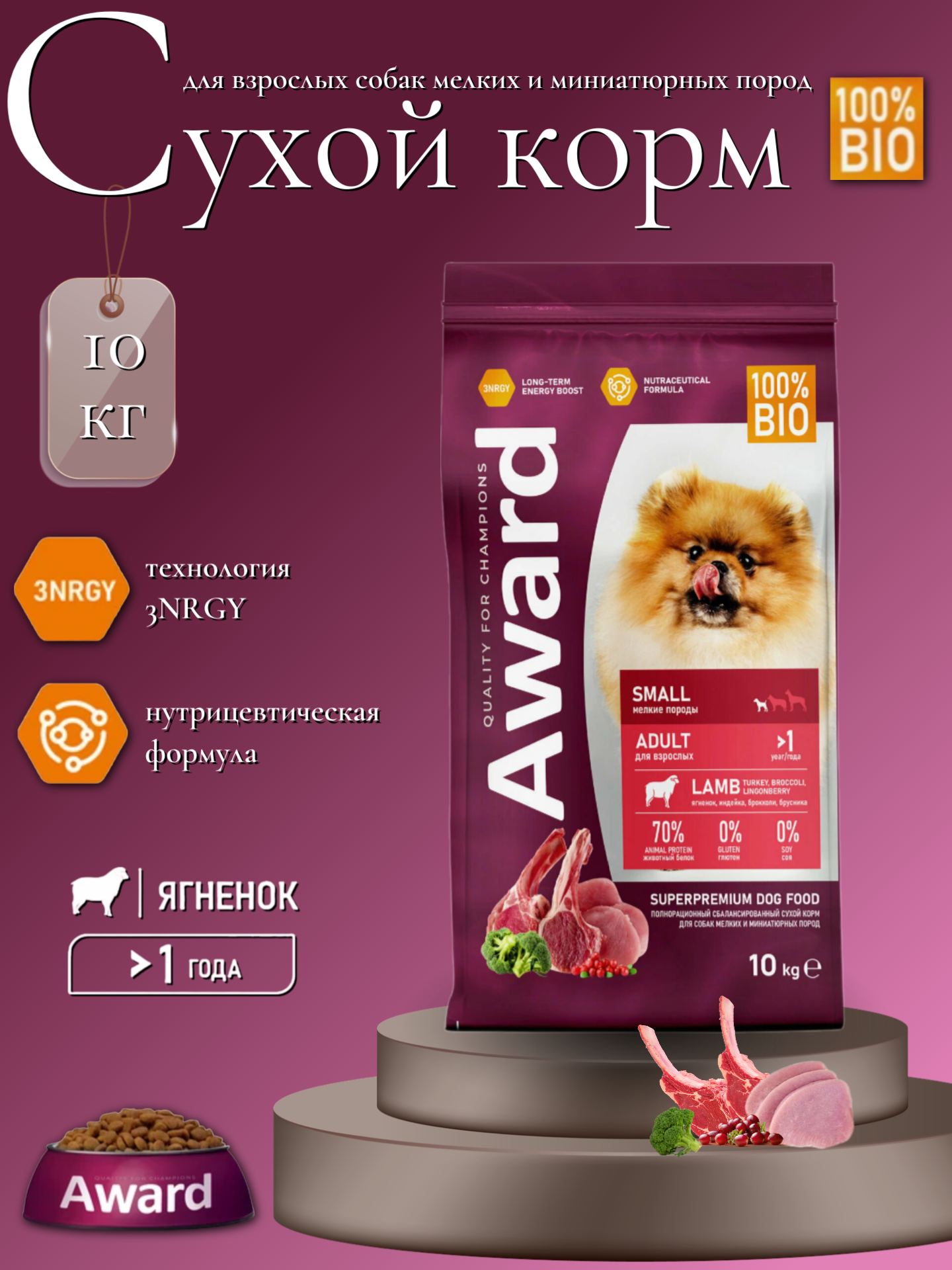Купить AWARD Сухой корм для взрослых собак мелких и миниатюрных пород с ягненком и индейкой с добавлением брокколи и брусники 10кг