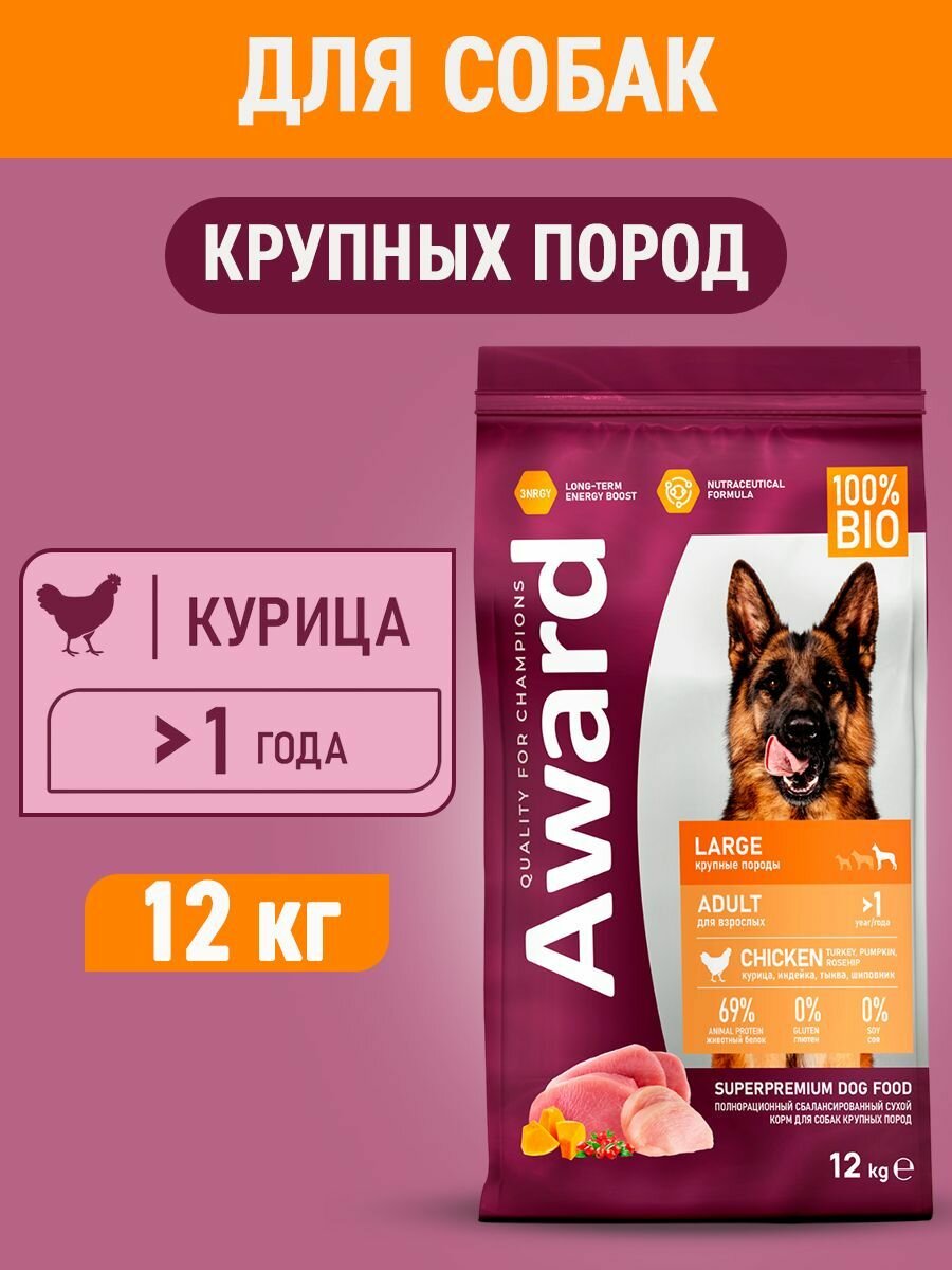 AWARD сухой корм для взрослых собак крупных пород, с курицей, индейкой, тыквой и шиповником - 12 кг
