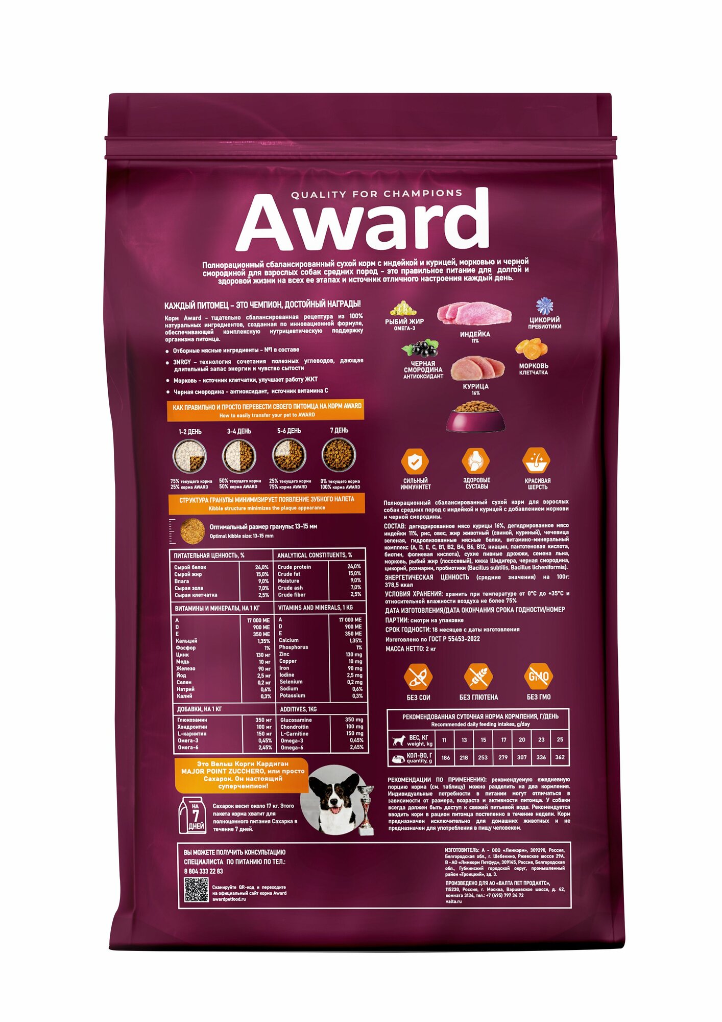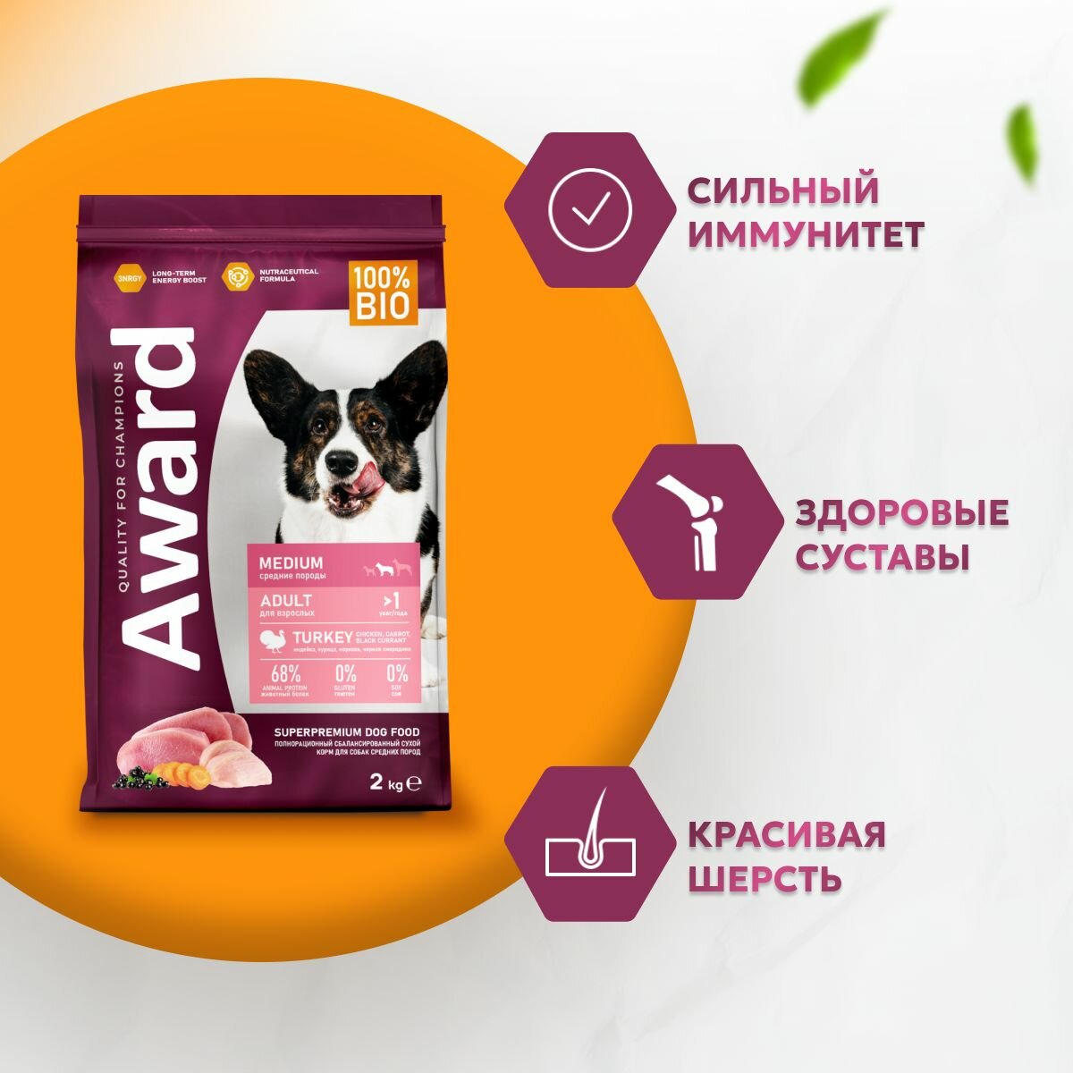 AWARD сухой корм для взрослых собак средних пород, с индейкой, курицей, морковью и черной смородиной - 2 кг