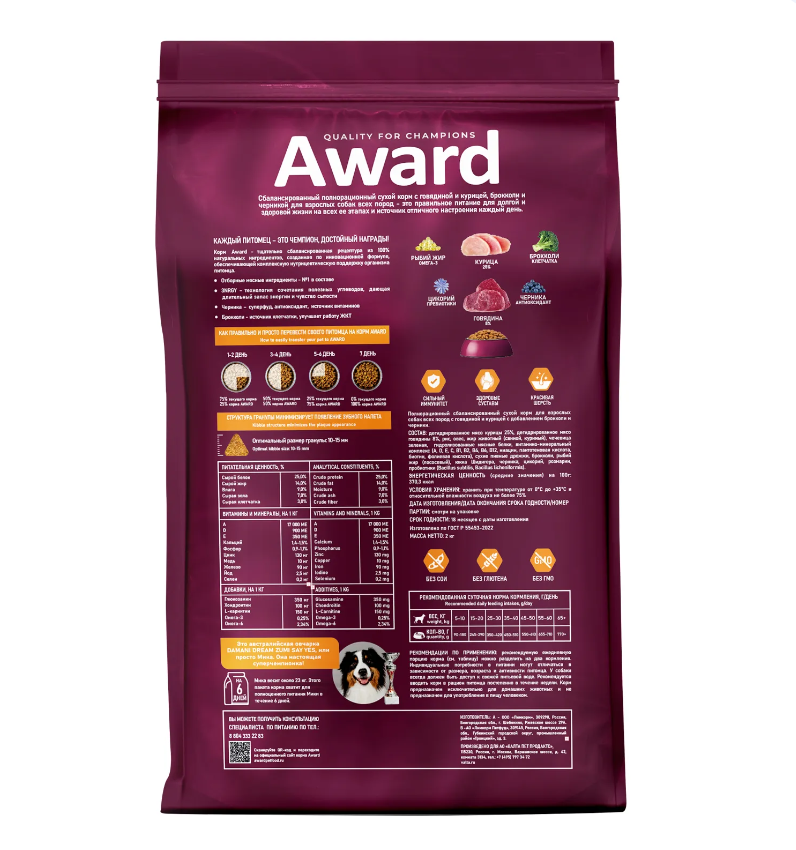 AWARD сухой корм для взрослых собак средних пород, с индейкой, курицей, морковью и черной смородиной - 2 кг
