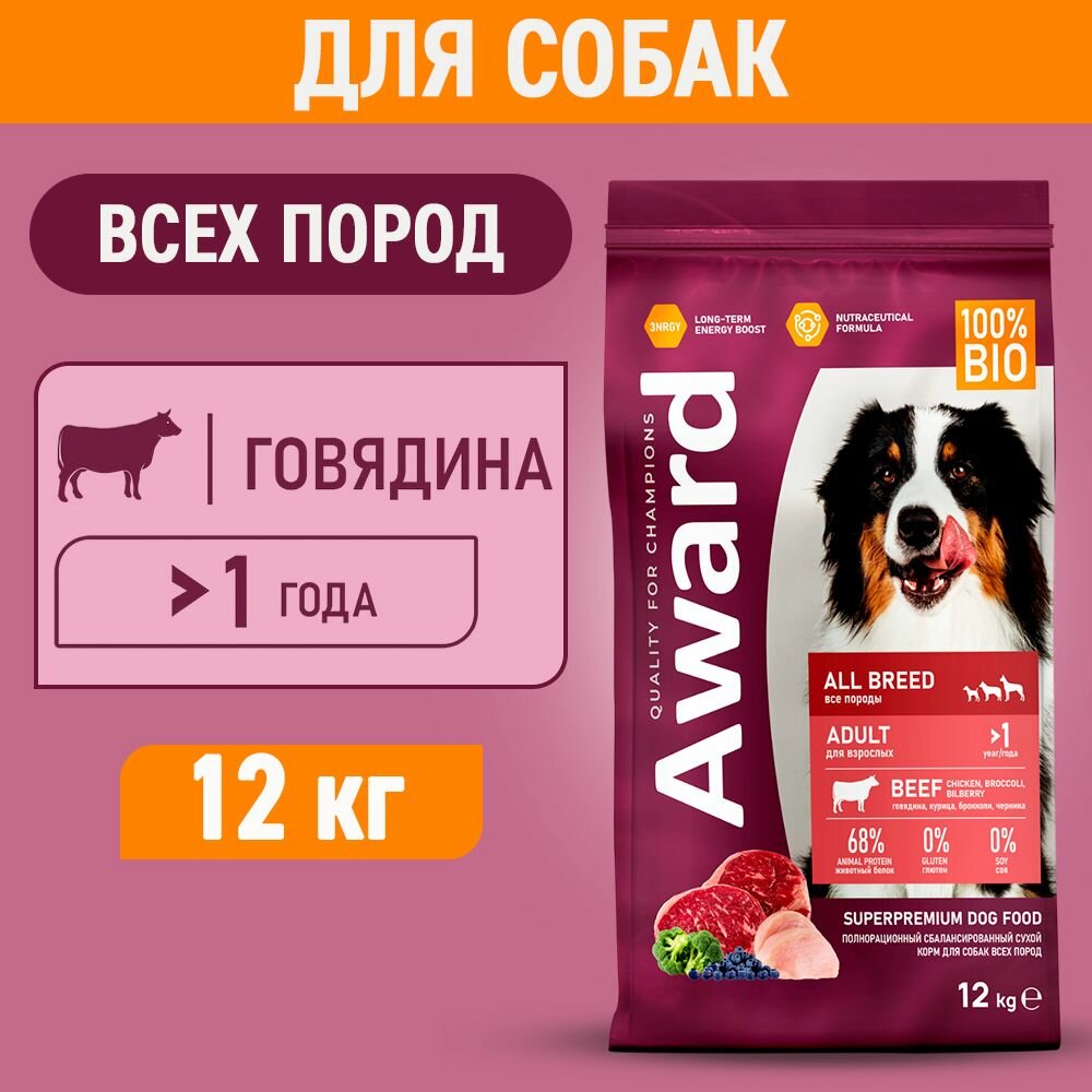 Сухой корм AWARD для взрослых собак всех пород с говядиной и курицей с добавлением брокколи и черники 12 кг