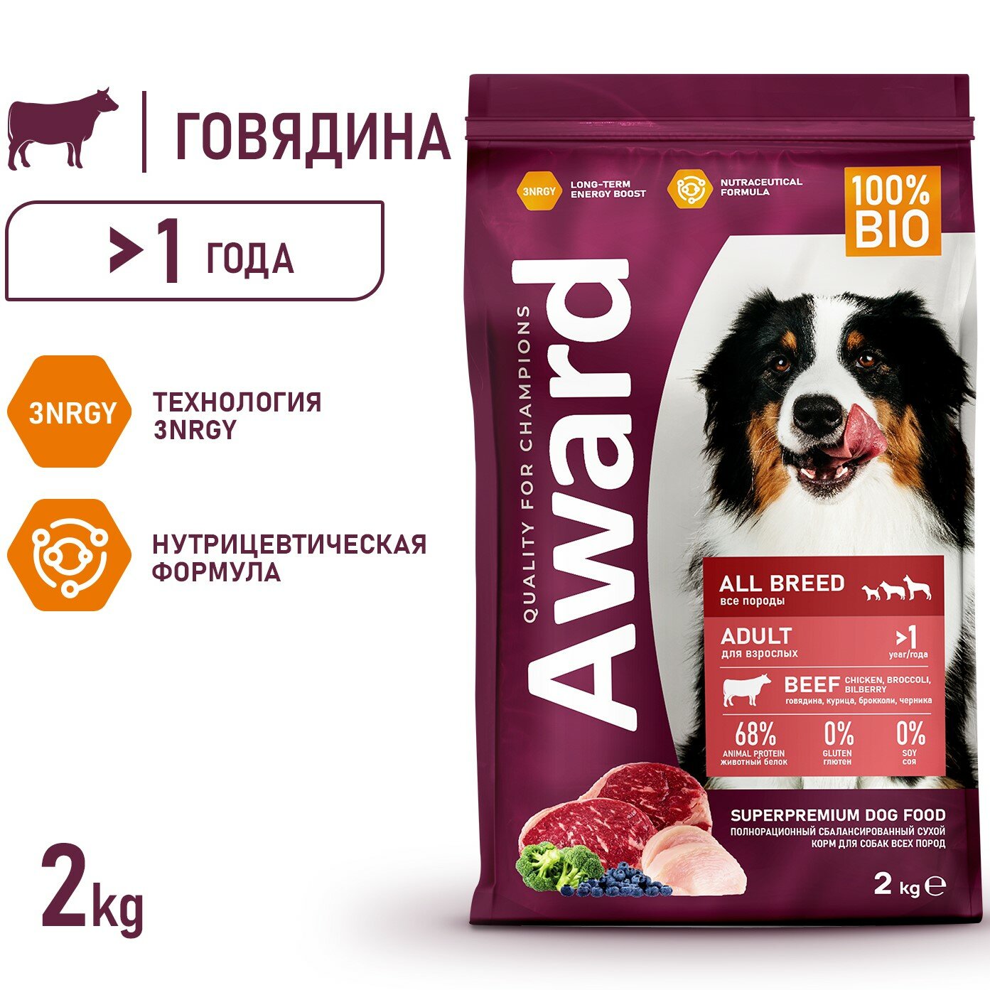 Купить Сухой корм AWARD для взрослых собак всех пород с говядиной и курицей с добавлением брокколи и черники 2кг