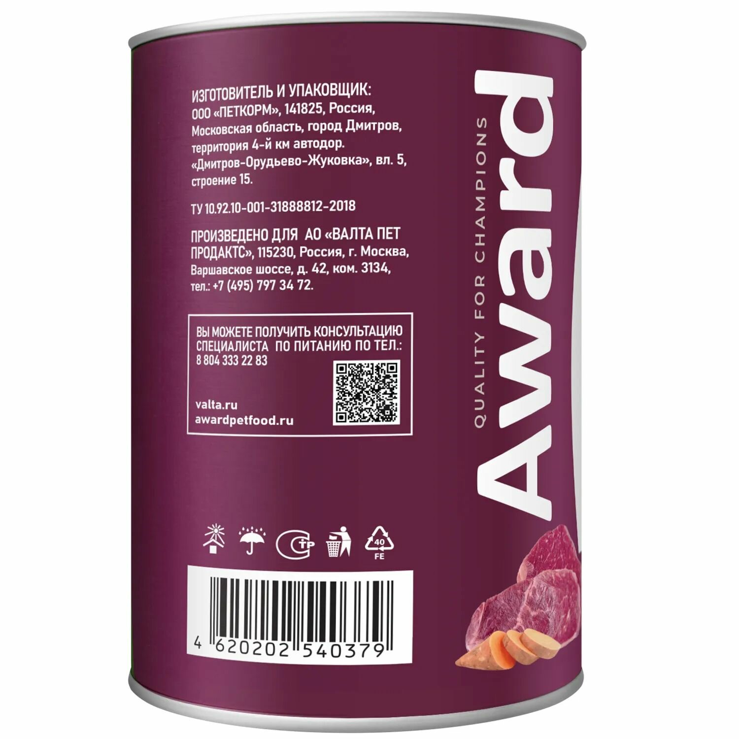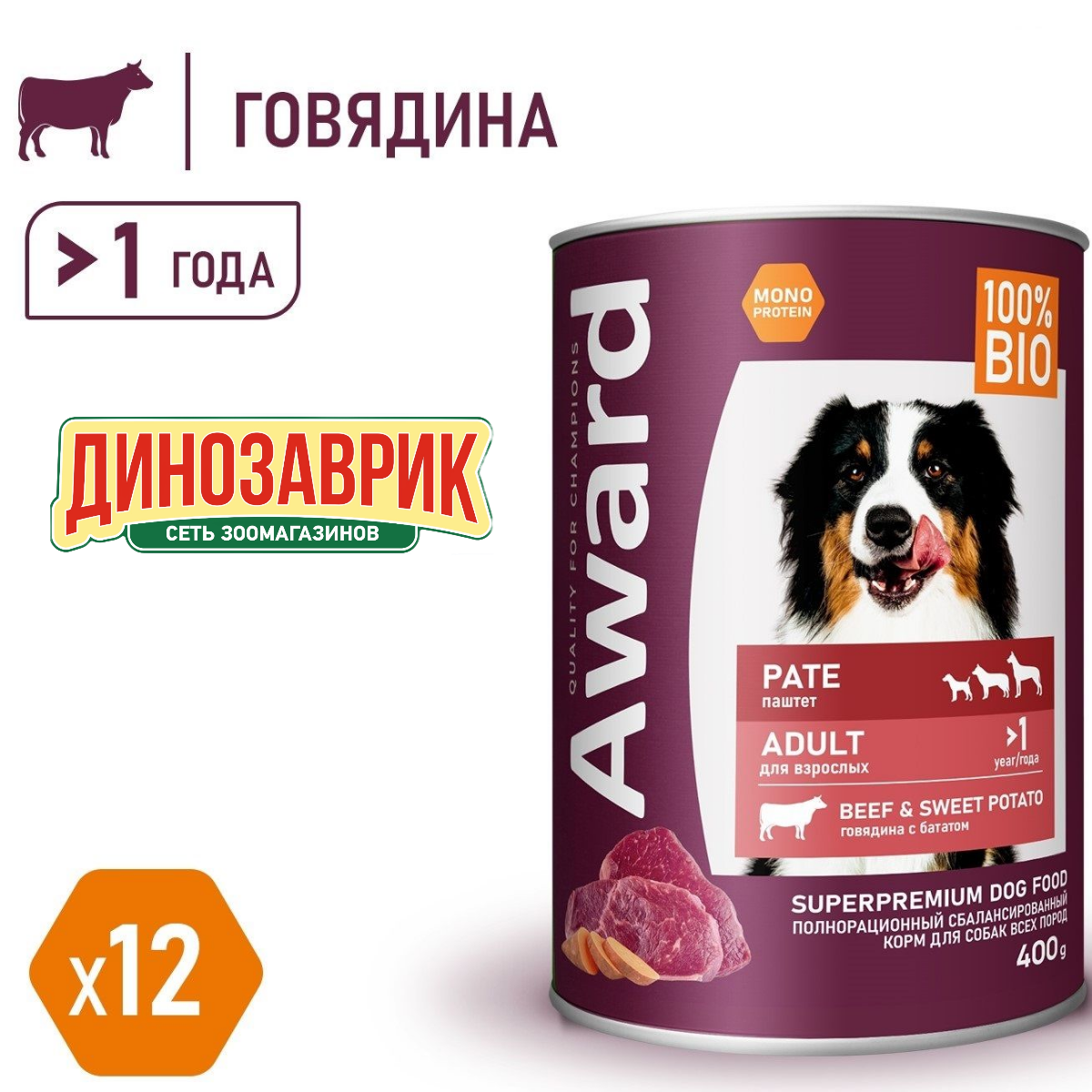 Влажный корм AWARD для собак паштет из говядины с бататом 400г * 12 шт