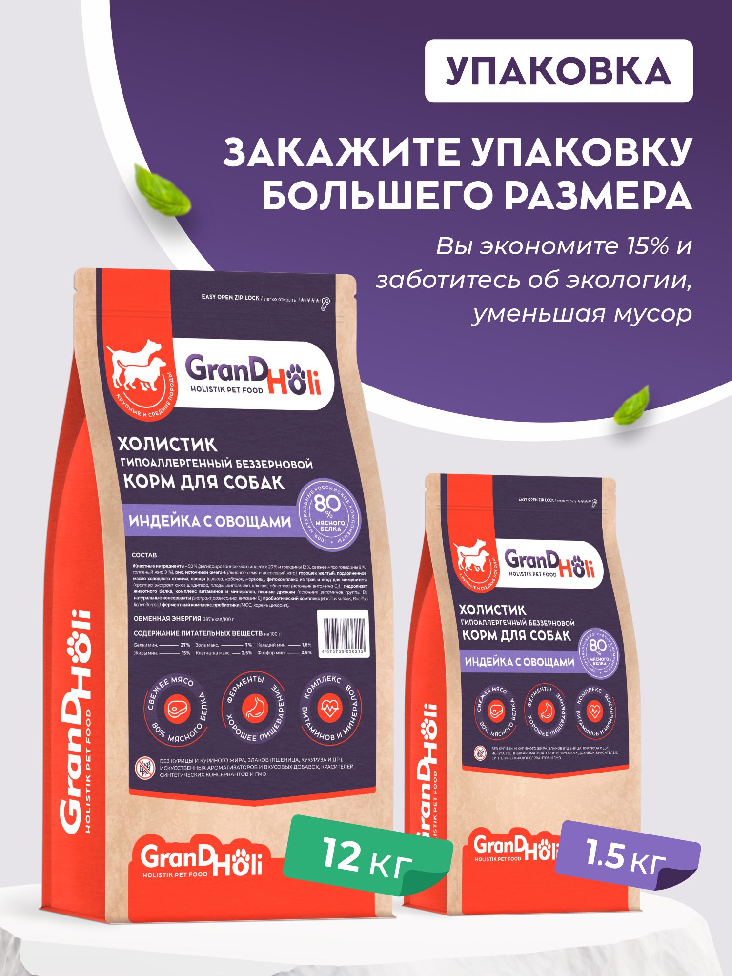 Сухой корм для собак GRANDHOLI холистик для крупных и средних пород "Индейка с овощами" 1,5 кг