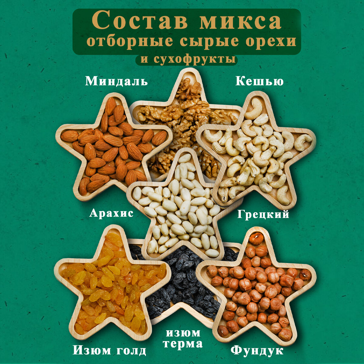 | Дополнительная информация | Миндаль сырой; Арахис сырой; Набор орехов; Орех фундук сырой очищенный; Кешью сырой сушеный |
