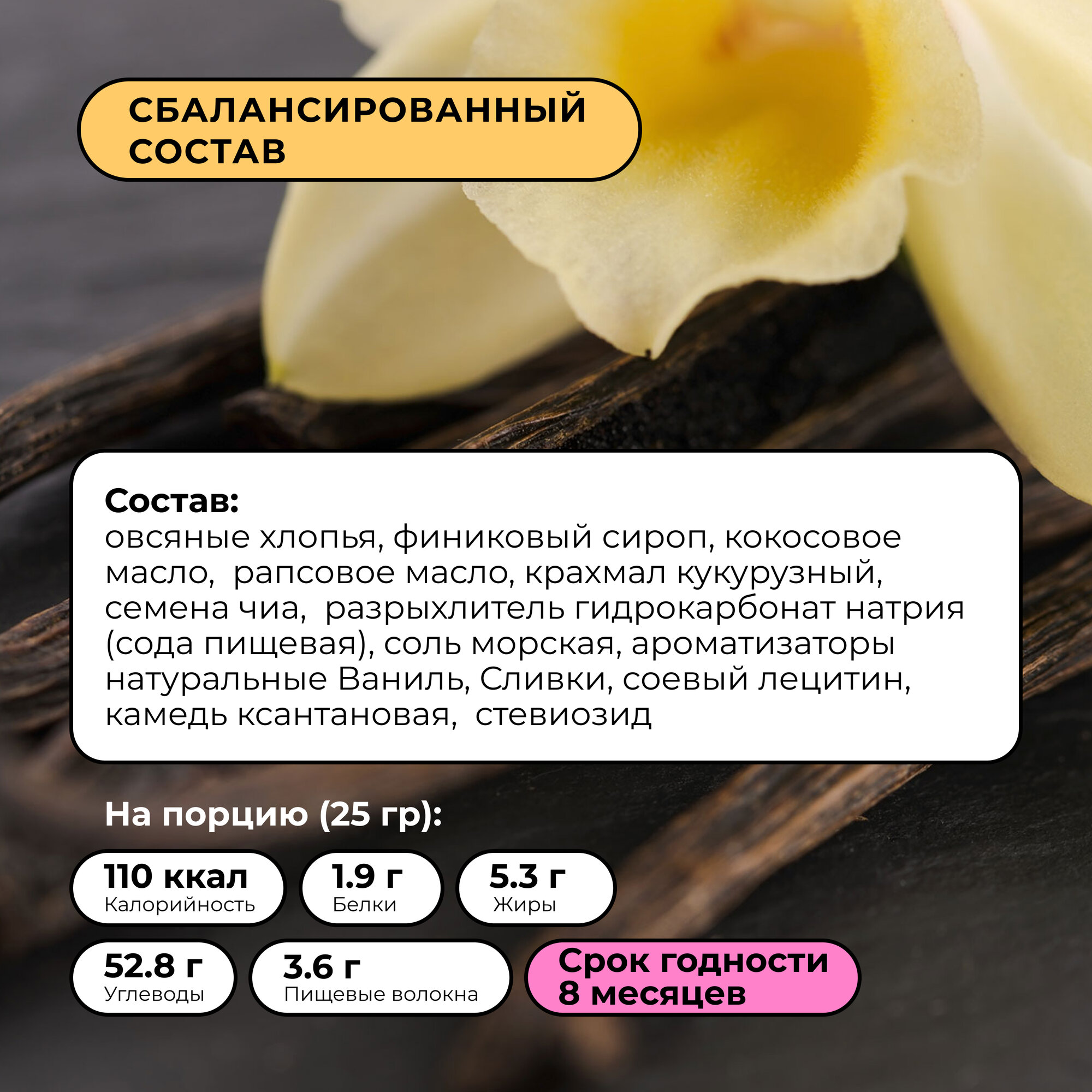 | Состав | хлопья овсяные, финиковый сироп, масло кокосовое, масло рапсовое, крахмал кукурузный, кокосовая стружка, семена чиа, разрыхлители: (пирофосфат натрия, гидрокарбонат аммония, гидрокарбонат натрия(сода пищевая)), соль морская, натуральный ароматизатор «кокос», эмульгатор - соевый лецитин, , загуститель – камедь ксантановая, подсластитель – стевизоид (экстракт стевии) . |