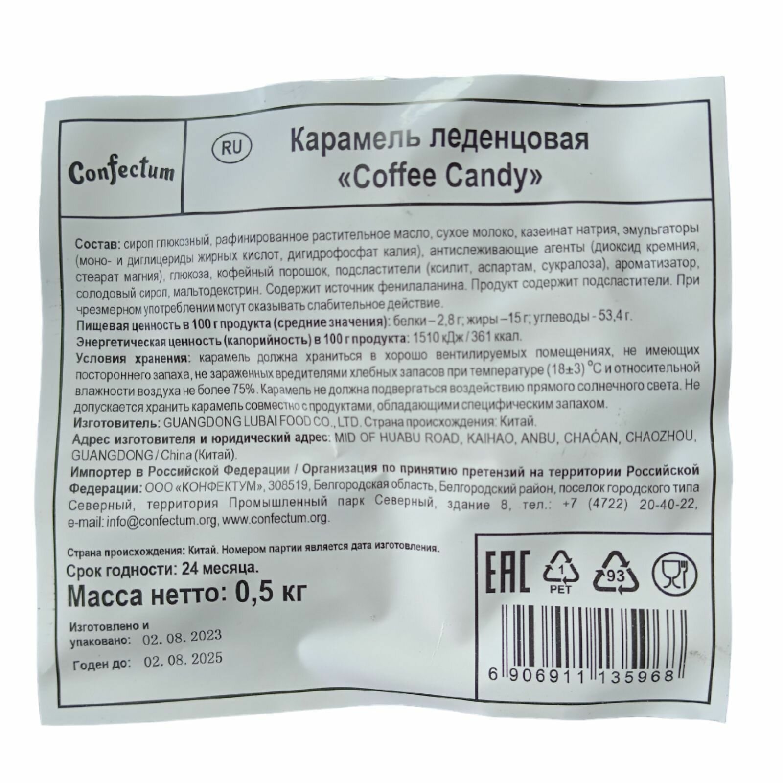 Карамель Confectum "Coffee Candy", 500г, леденцовая, со вкусом кофе