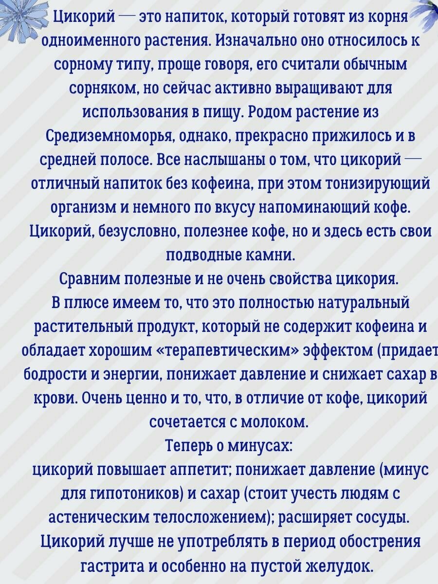 | Способ приготовления | положить 1-2 чайные ложки цикория в чашку. Залить кипятком и перемешать. Сахар, молоко или сливки добавлять по вкусу. |