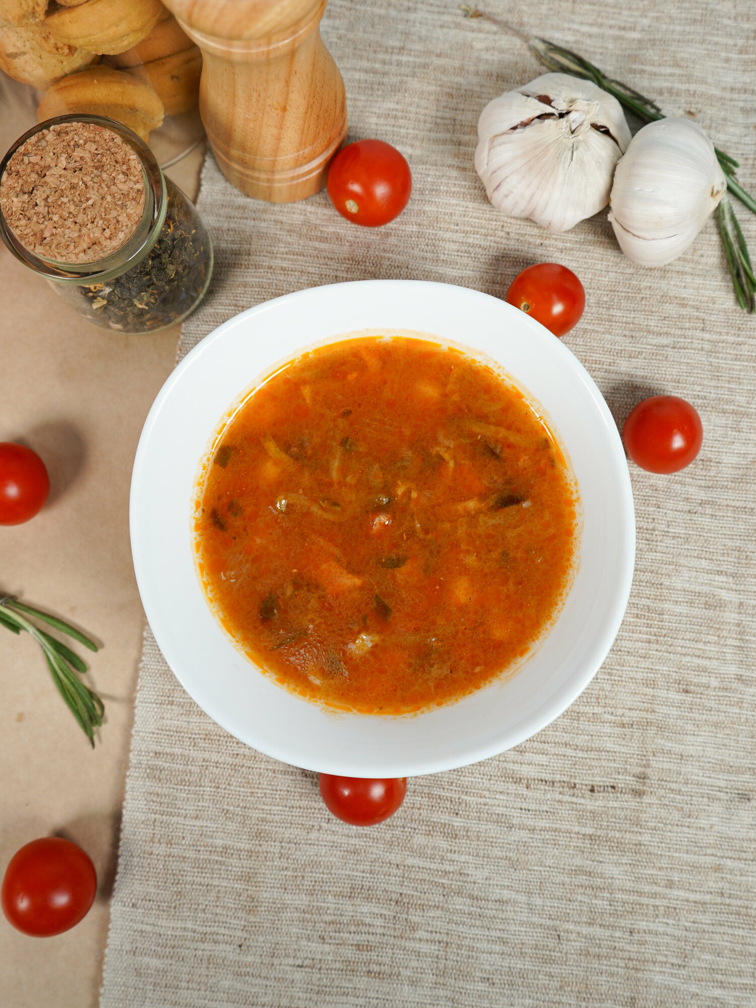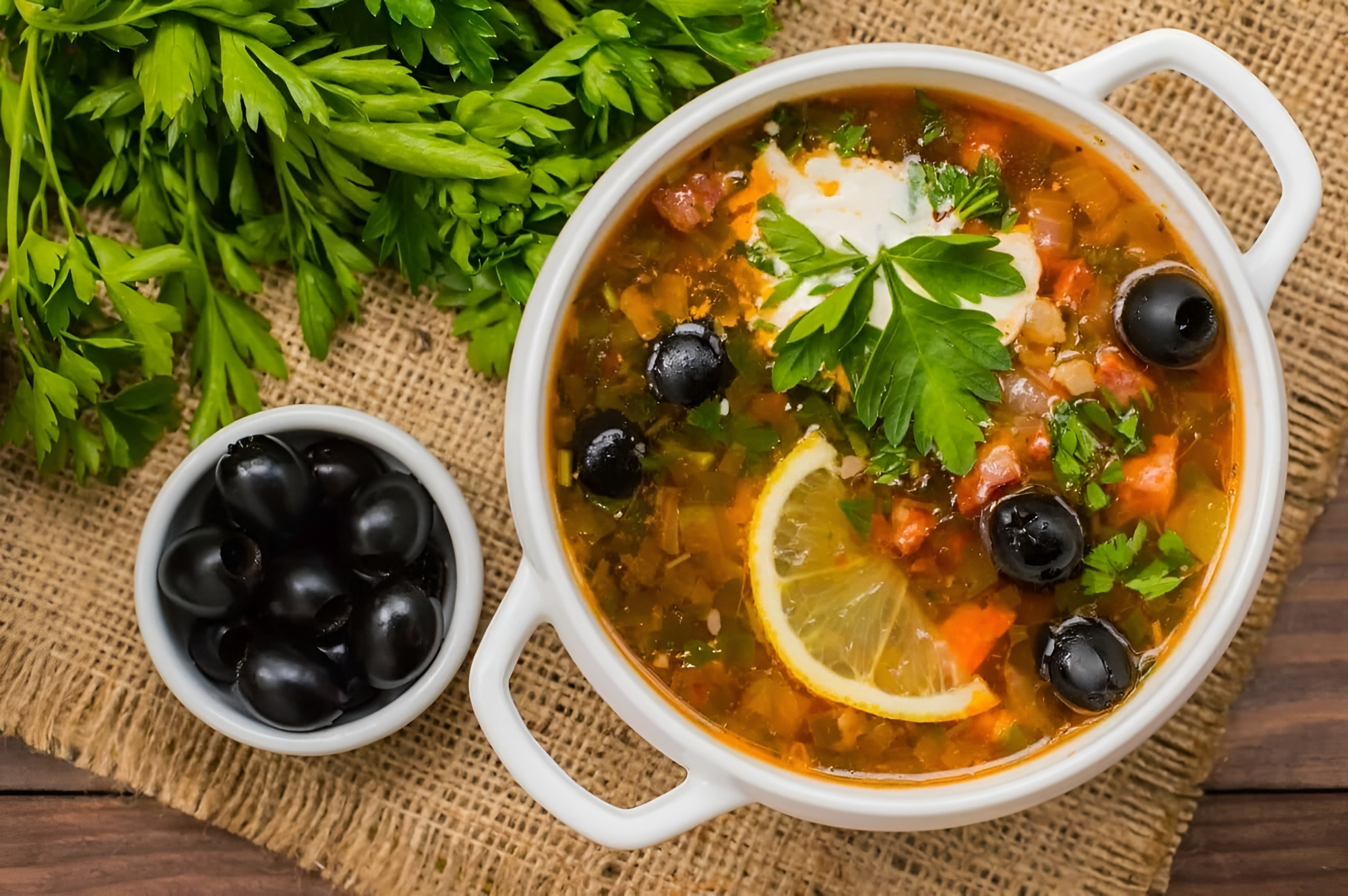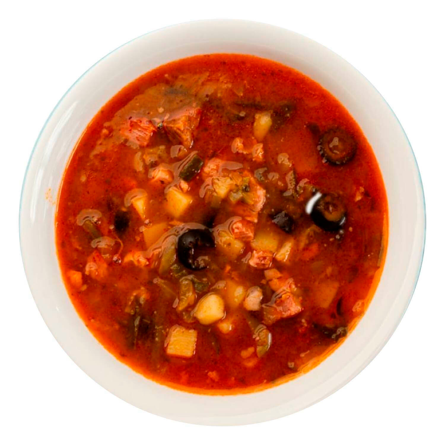 | Состав | бульон говяжий жидкий, огурцы консервированные, лук репчатый свежий, картофель свежий, мясо отварное (говядина), окорок свиной варёно-копченый, окорок куриный копчено-вареный, паста томатная, маслины черные резаные, масло подсолнечное рафинированное, соль, перец черный молотый, петрушка (зелень) сушеная, регулятор кислотности - кислота лимонная, лист лавровый. |