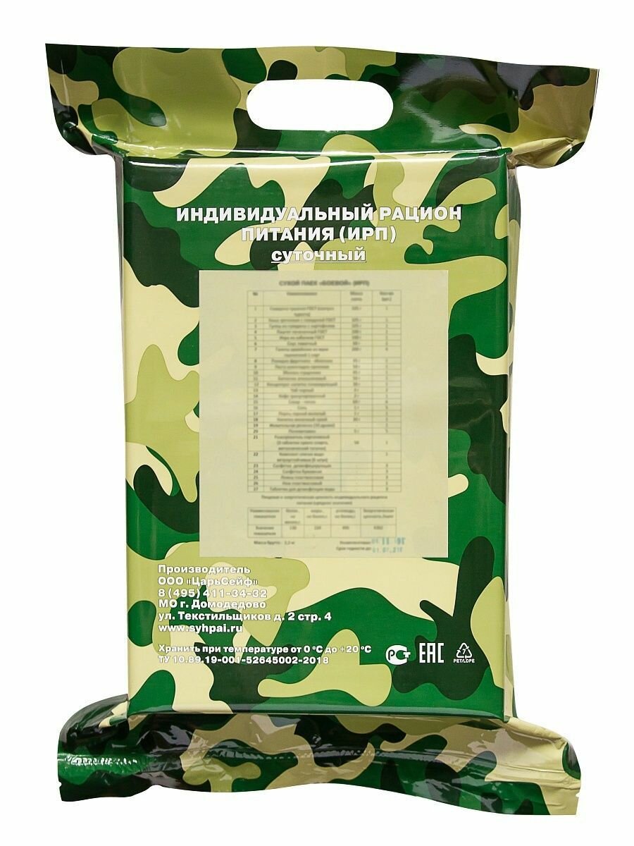 | Состав | Говядина тушеная (высший сорт) ГОСТ 250 г — 1 шт. Каша гречневая с говядиной ГОСТ 250 г — 1 шт. Мясо с овощным ассорти ГОСТ 250 г — 1 шт. Паштет печеночный ГОСТ 100 г — 1 шт. Икра из кабачков ГОСТ 100 г — 1 шт. Галеты армейские из муки пшеничной 1 сорта 200 г — 4 шт. Повидло фруктовое-яблочное 45 г — 1 шт. Шоколадно-ореховая паста 50 г — 1 шт. Концентрат напитка тонизирующий 30 г — 1 шт. Напиток молочный сухой 30 г — 1шт. Чай черный 4 г — 2 шт. Кофе гранулированный 2 г — 1 шт. Сахар-песок 60 г — 3 шт. Соль 5 г — 1 шт. Перец черный молотый 1 г — 1 шт. Поливитамин 1 г — 1 шт. Разогреватель портативный(3 таблетки сухого спирта,металлический таганок) 50 г — 1 уп. Комплект спички водо-ветроустойчивые (6 шт) — 1 уп. Таблетка для дезинфекции воды — 3 шт. Салфетка дезинфицирующая для рук — 3 шт. Салфетка бумажная — 3 шт. Ложка пластмассовая — 3 шт. Белки – 113 г Жиры — 195 г Углеводы – 390 г Энергетическая ценность – 3950 ккал. |