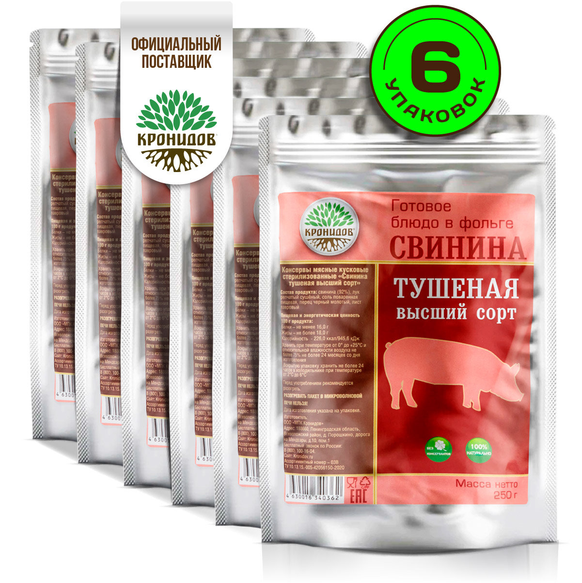 Кронидов Свинина тушеная Высший сорт Готовое блюдо в фольге. Консерва натуральная Набор 6 шт. по 250 г