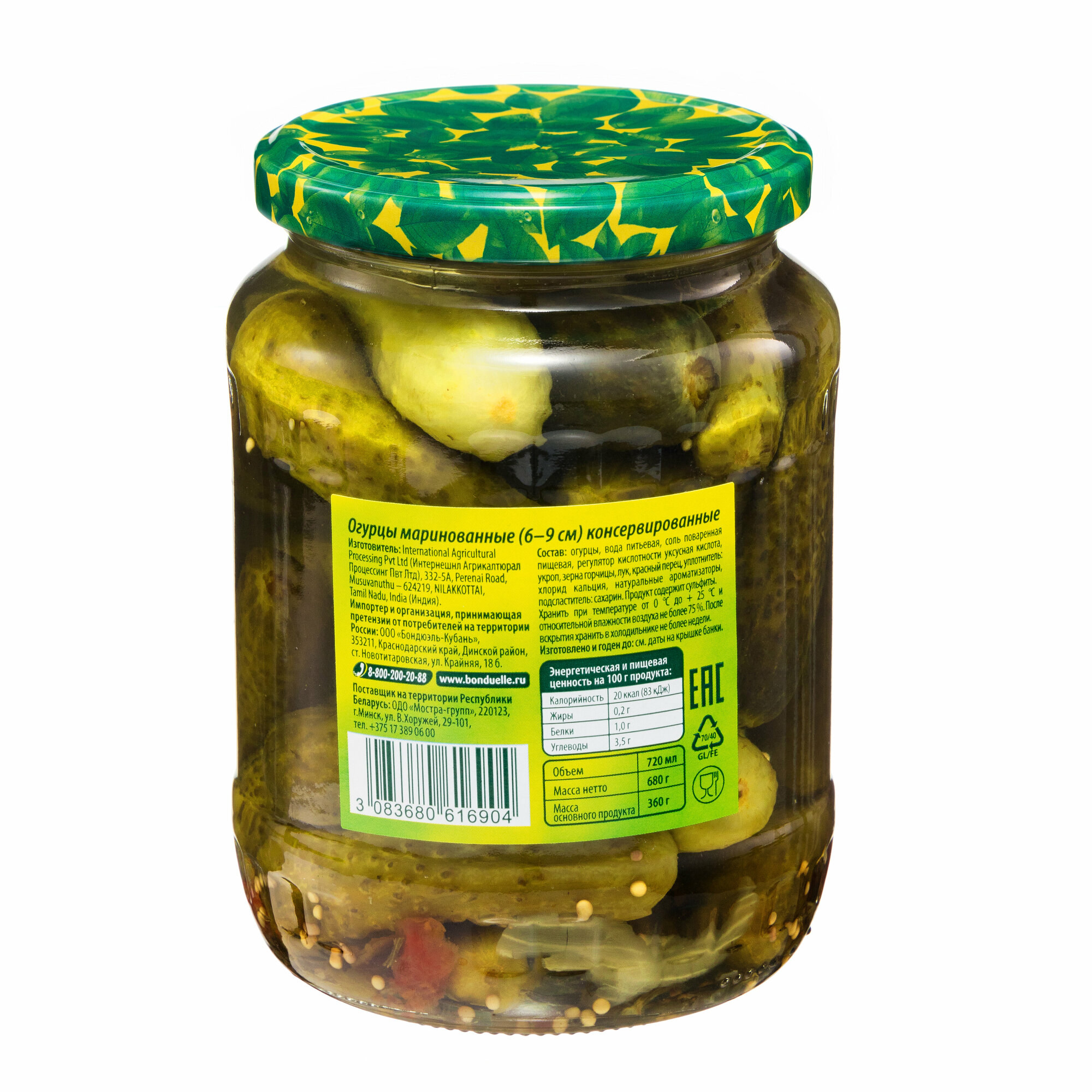 | Состав | корнишоны, вода, соль, уксус, укроп, зерна горчицы, лук, красный перец, отвердитель: хлорид кальция натуральные ароматизаторы, подсластитель: сахарин |