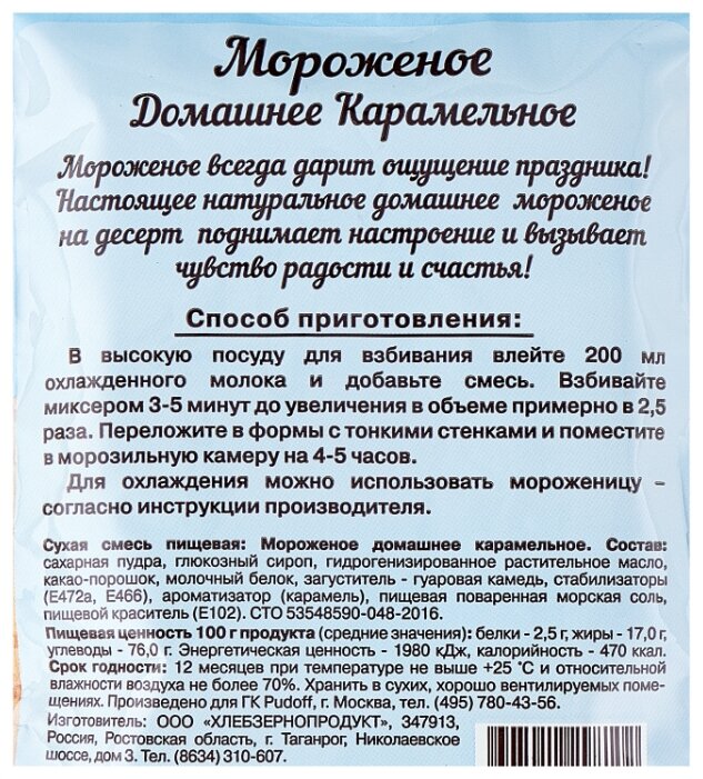 | Дополнительная информация | Вкус и аромат нежной сливочной карамели отлично передает домашнее карамельное мороженое на основе готовой смеси «С.Пудовъ». В итоге это превосходное мороженое дарит настоящее наслаждение вкусом. Дарите радость детства близким так часто, как вы этого захотите. И себя можно побаловать! |
