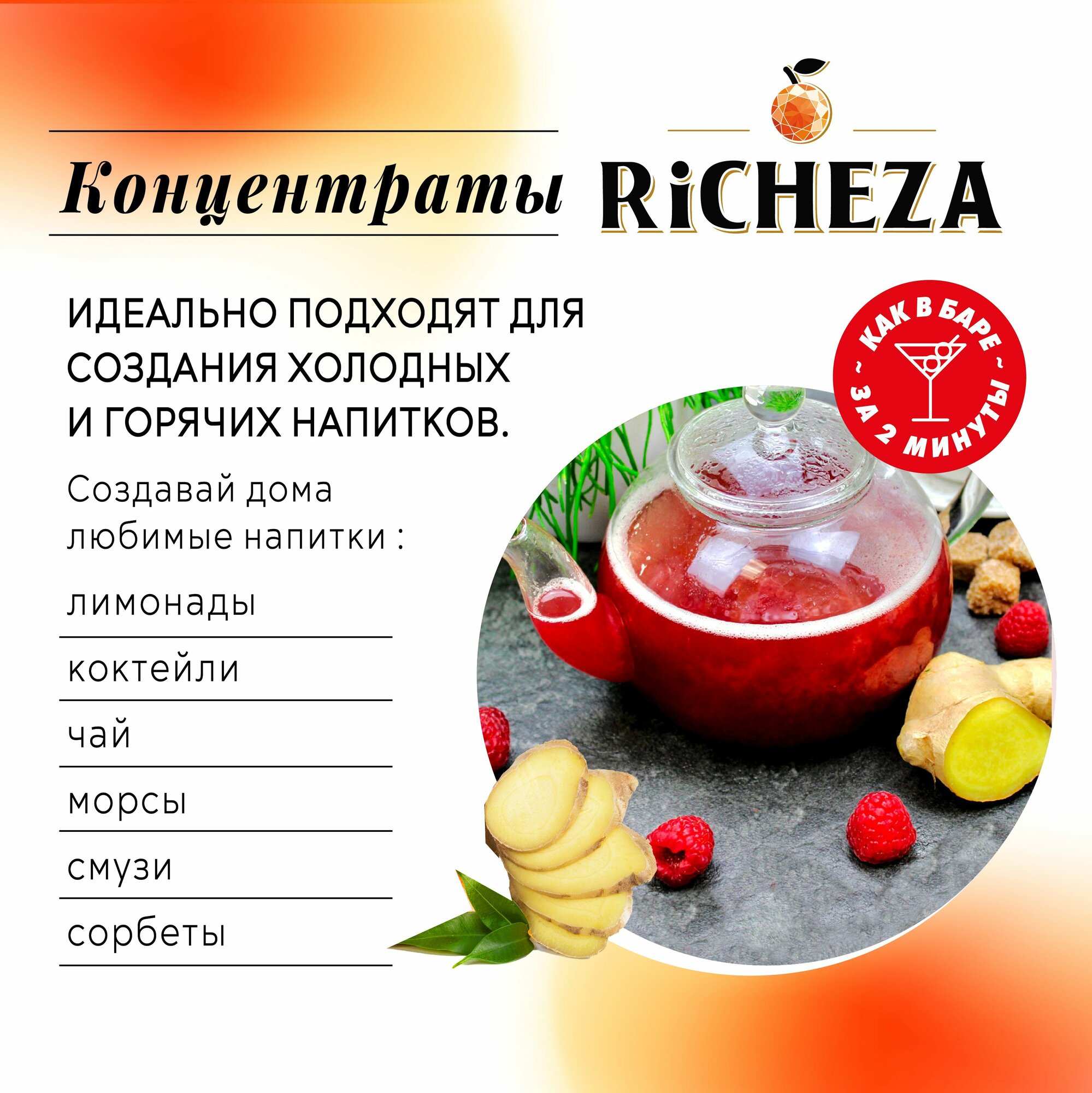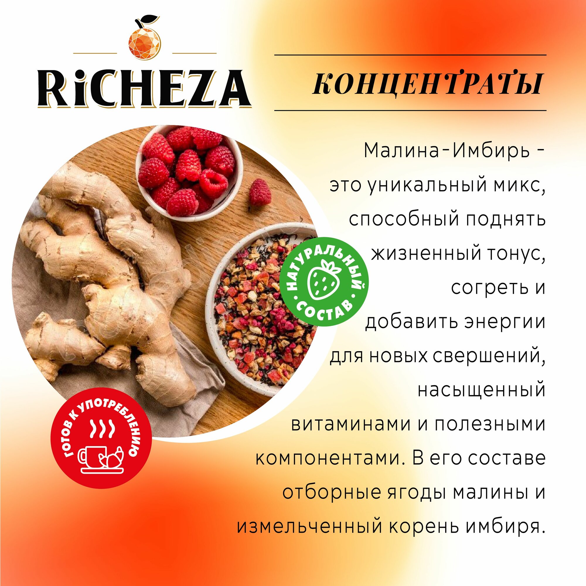Концентрат Основа для приготовления напитков Richeza Ричеза Апельсин-Имбирь, натуральный концентрат для чая, коктейля, смузи, лимонада, 1 кг.