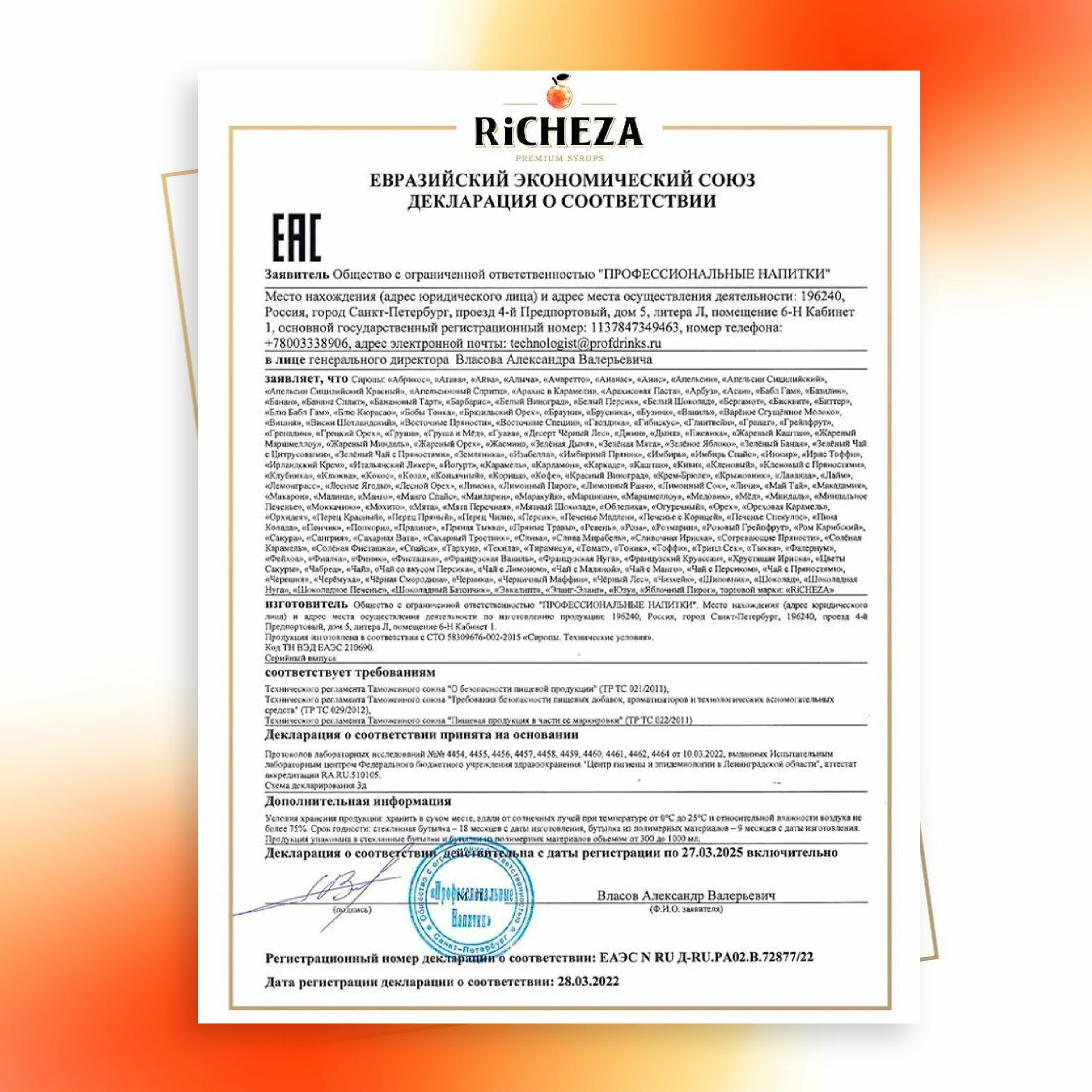 Концентрат для приготовления напитков Richeza Ричеза Персик, натуральный концентрат для чая, коктейля, смузи, лимонада, 1 кг.