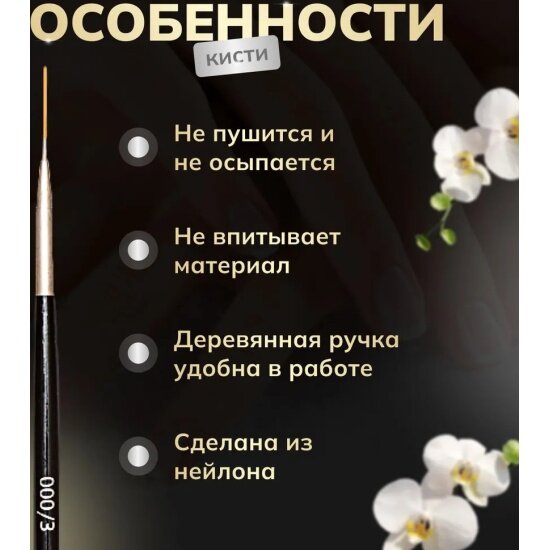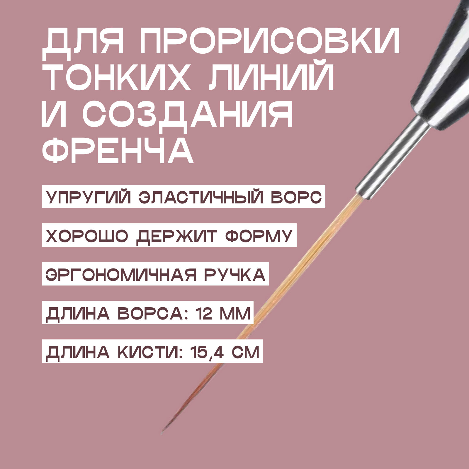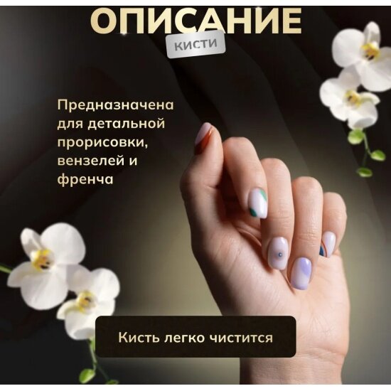 | Дополнительная информация | кисть для прорисовки тонких линий, вензелей, френча; длина ворса 12 мм, длина кисти 15,4 см |