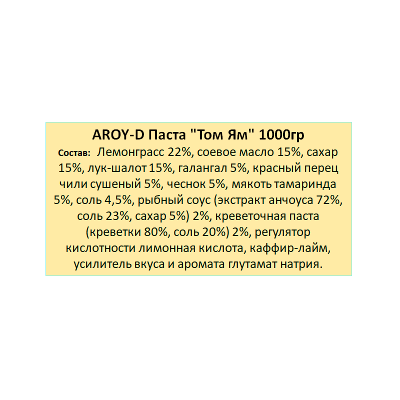 | Состав | лемонграсс 24%, соевое масло, сахар, лук-шалот, галангал, красный перец чили сушеный, чеснок, мякоть тамаринда, соль, регулятор кислотности лимонная кислота, усилитель вкуса и аромата глутамат натрия, рыбный соус (экстракт анчоуса, соль, вода), каффир-лайм, креветочный порошок. |