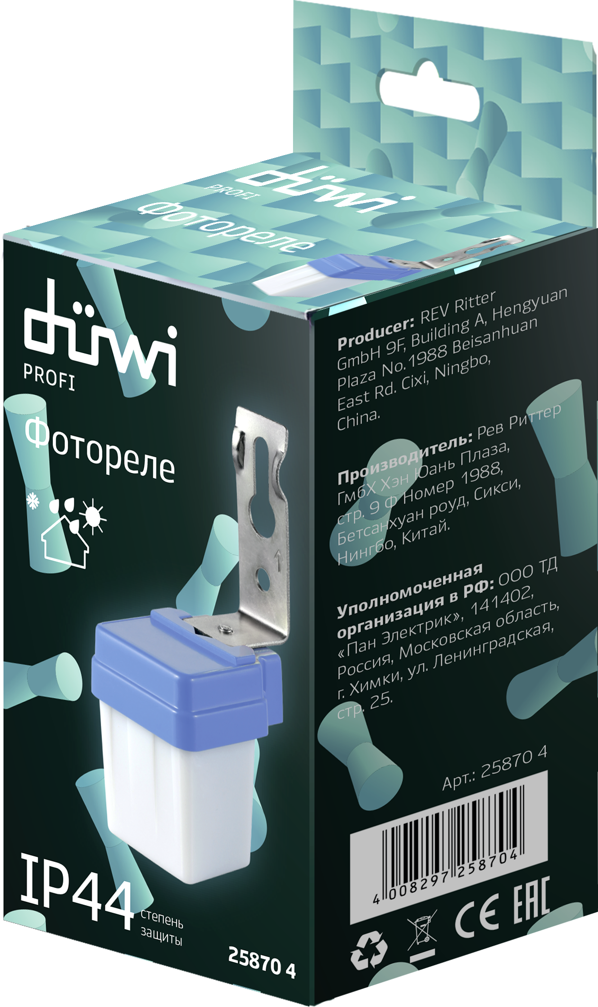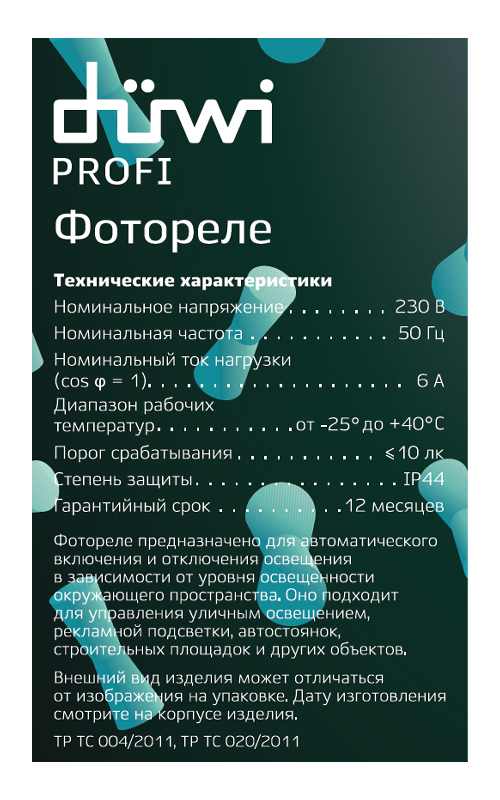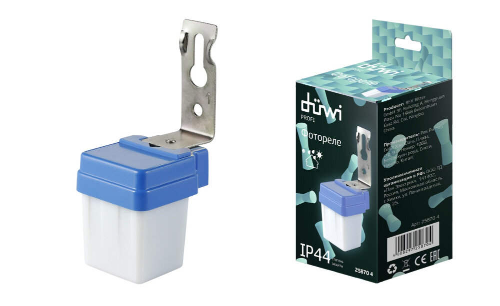| Дополнительная информация | Фотореле DUWI 6А IP44 пластик |