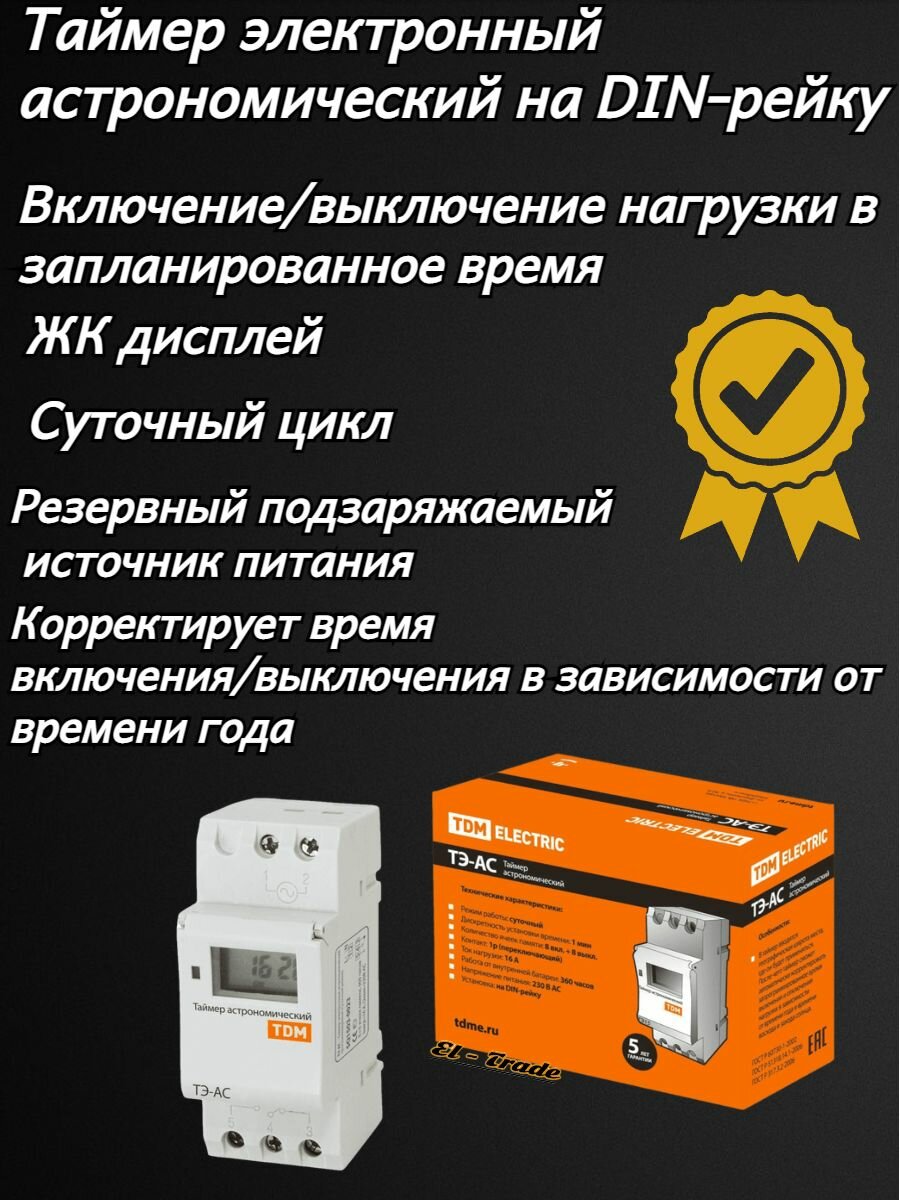 TDM Таймер электронный ТЭ-АС-1мин/24ч-8on/off-16А-DIN астрономический SQ1503-0023 интересное: